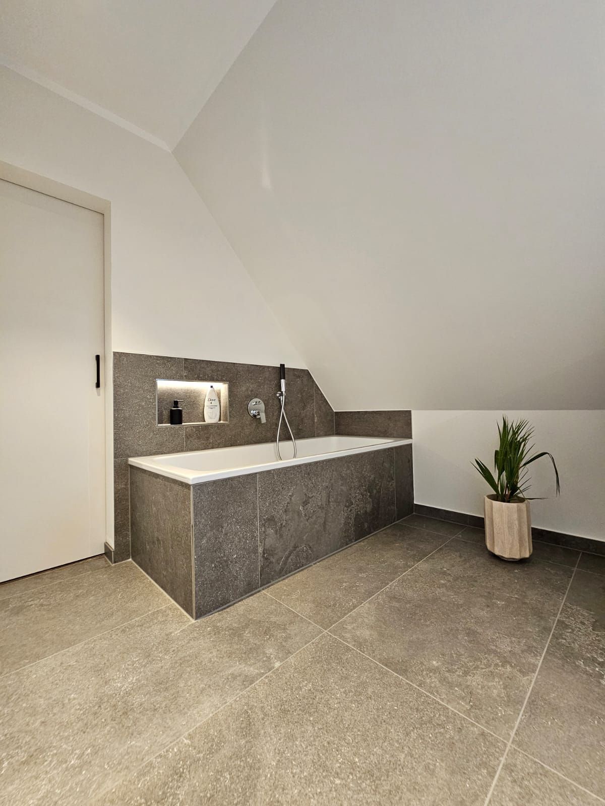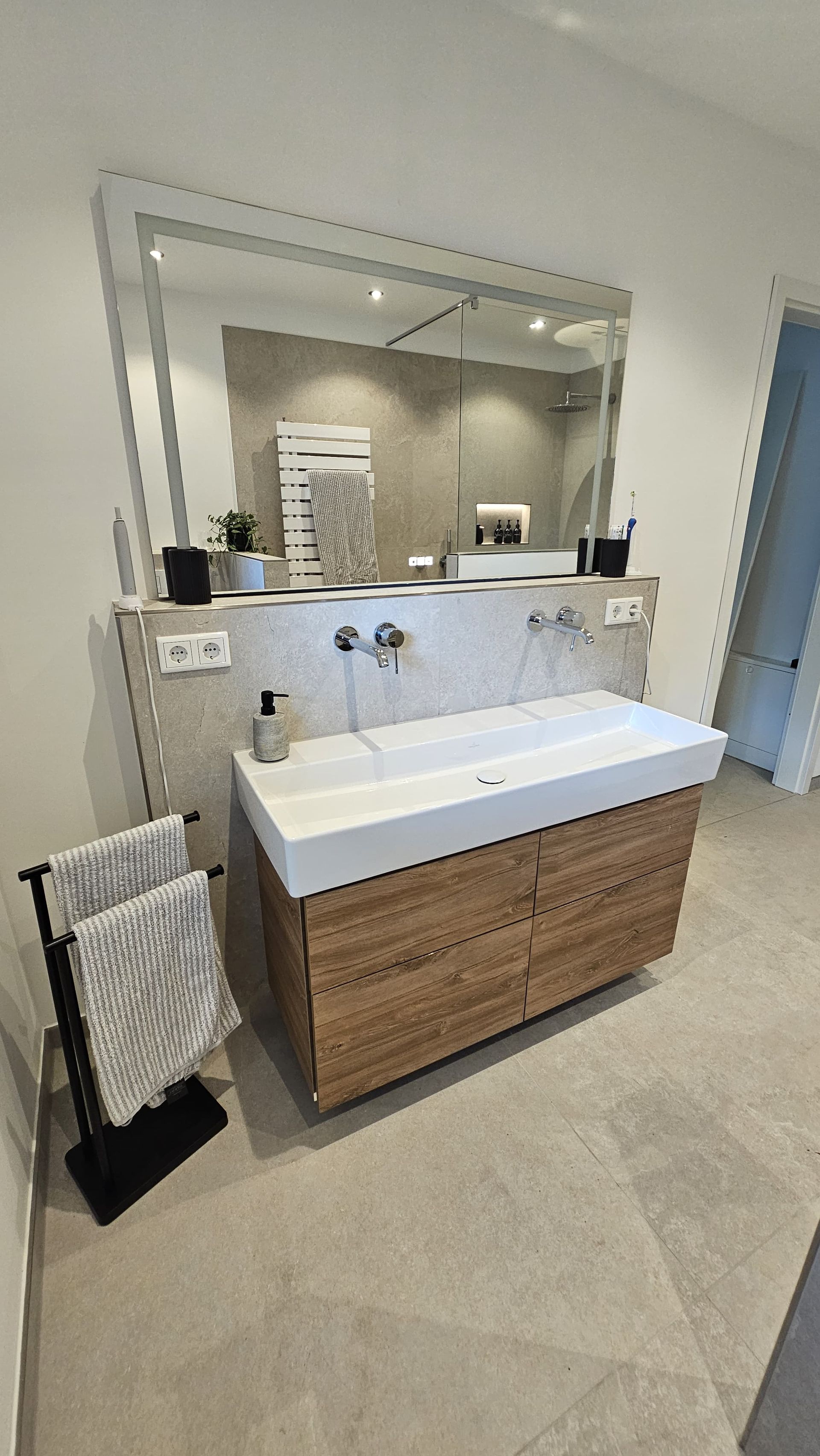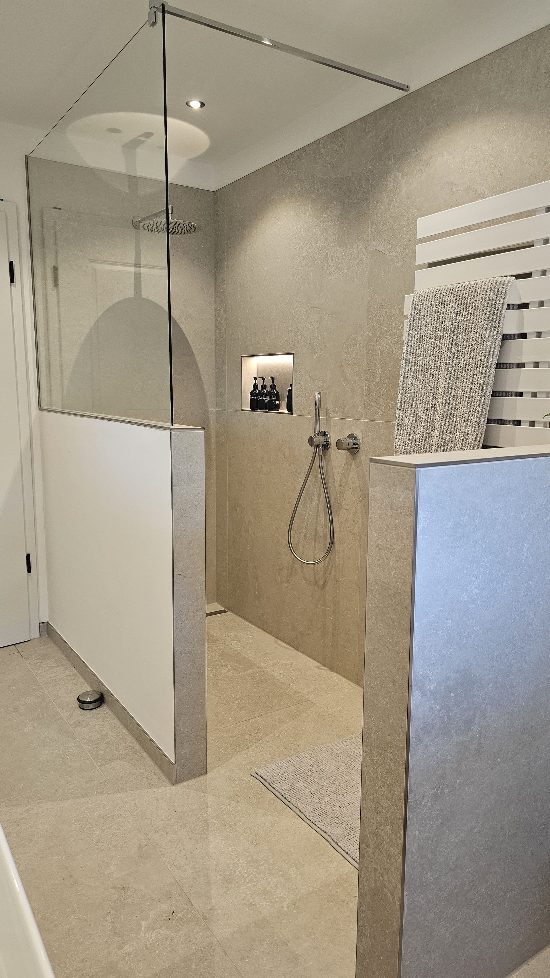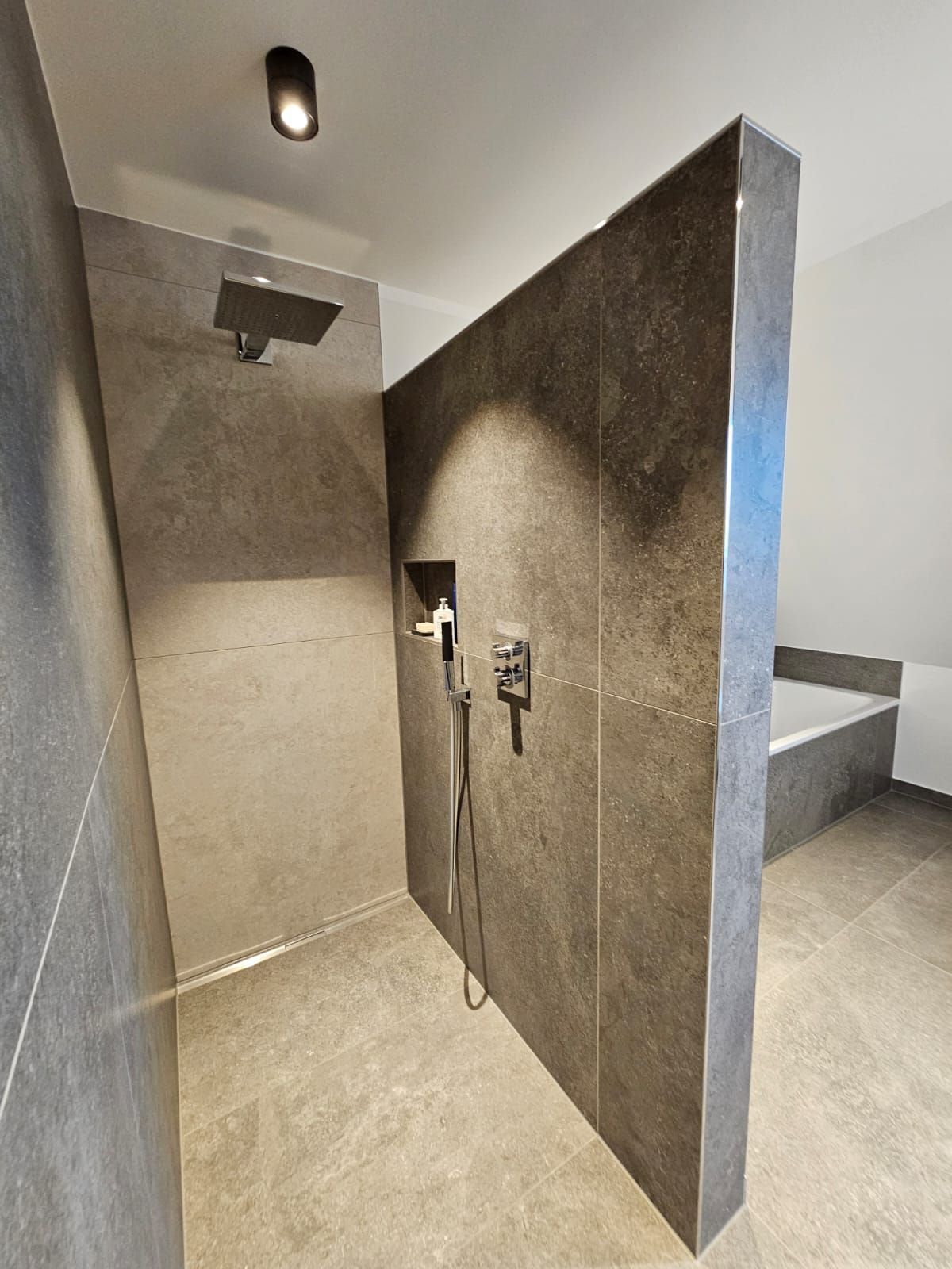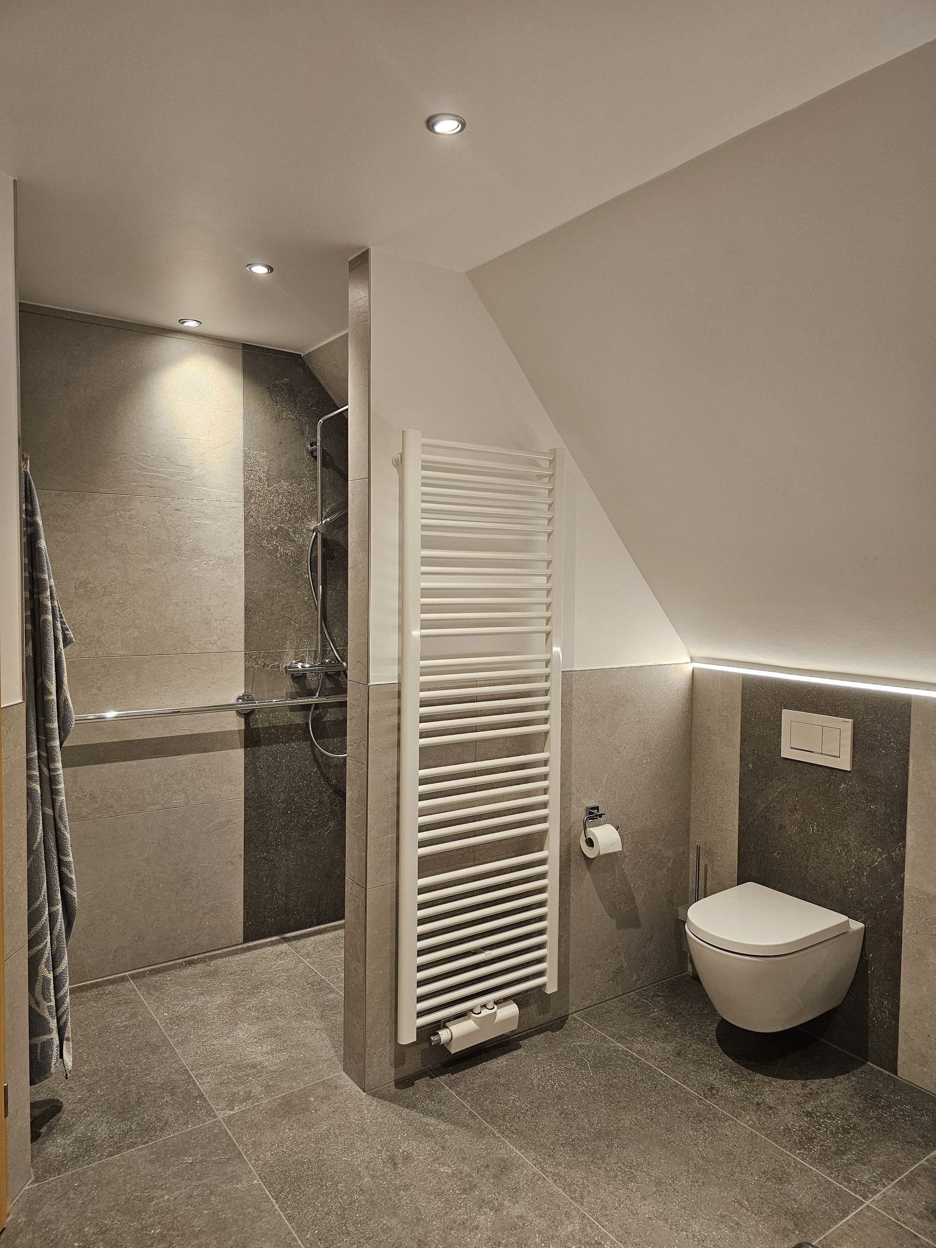 Badsanierung mit Lichtakzenten und Feinsteinzeugfliesen im Format 60x120