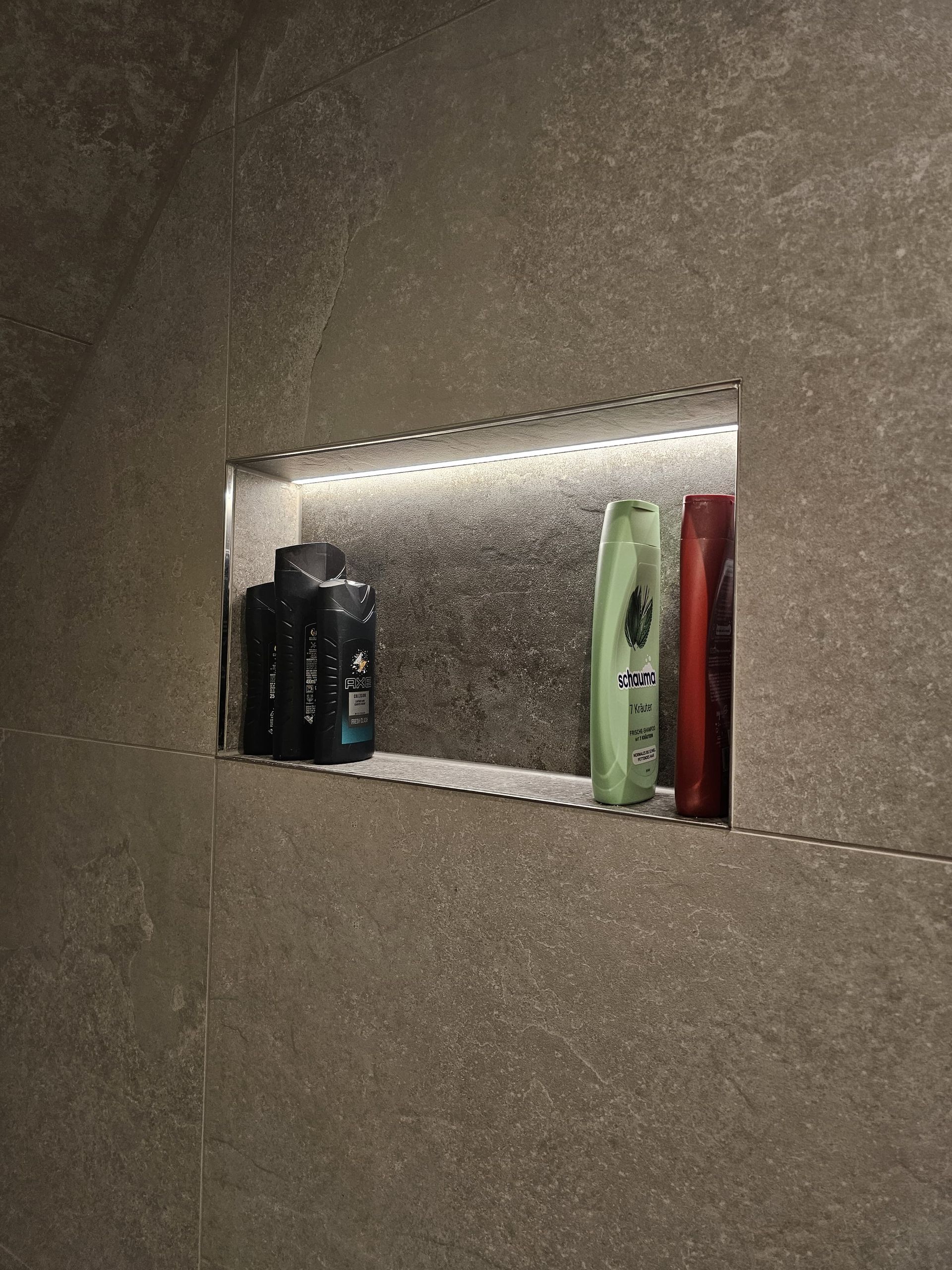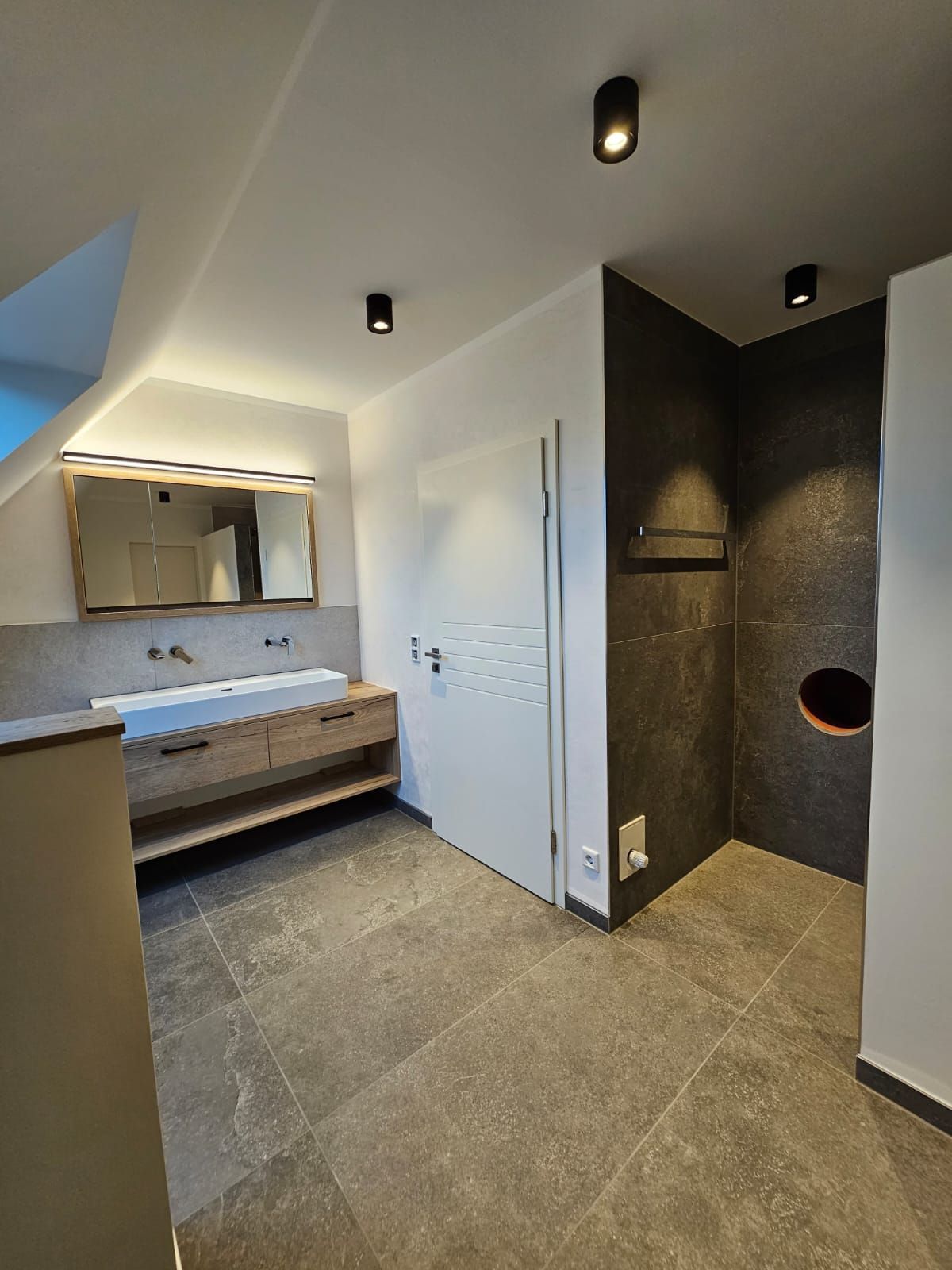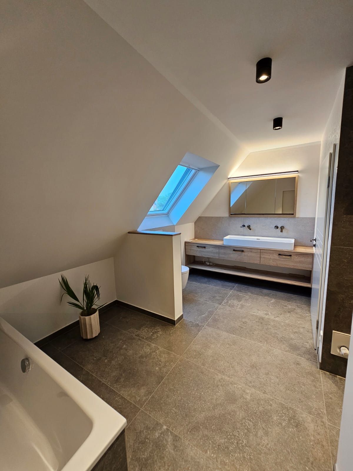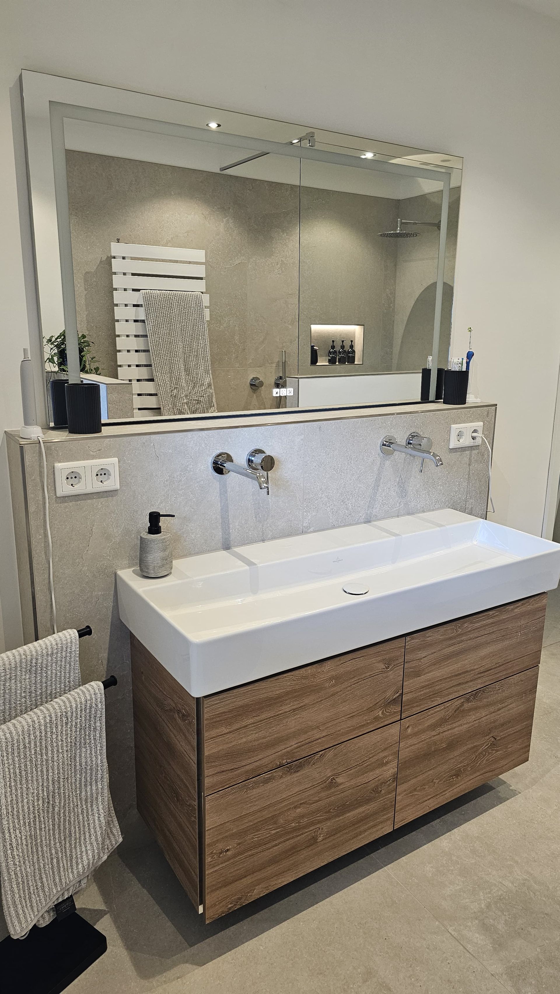 Badsanierung mit Lichtakzenten und Feinsteinzeugfliesen im Format 60x120