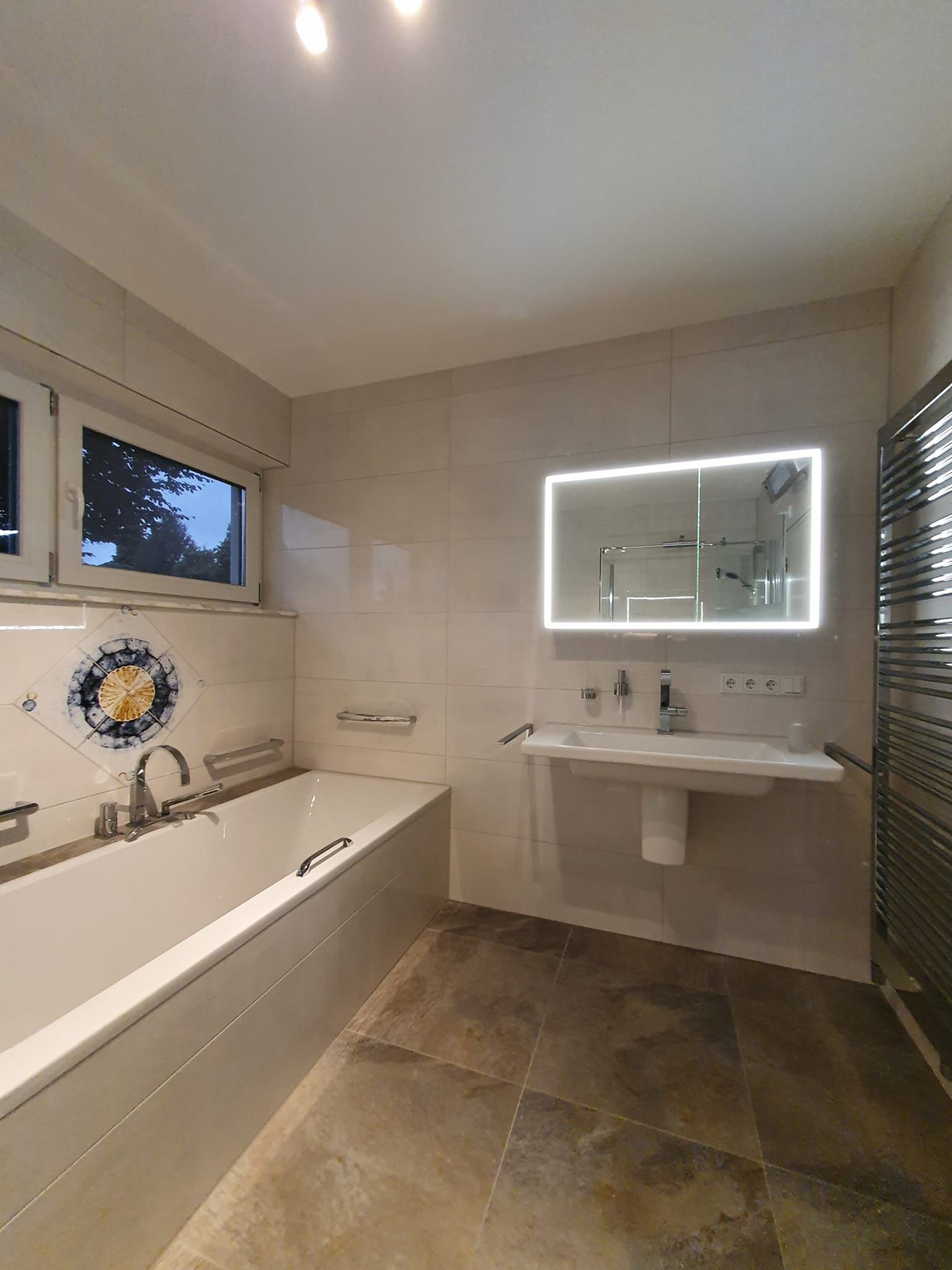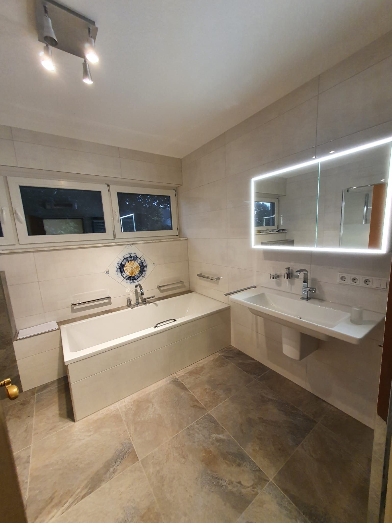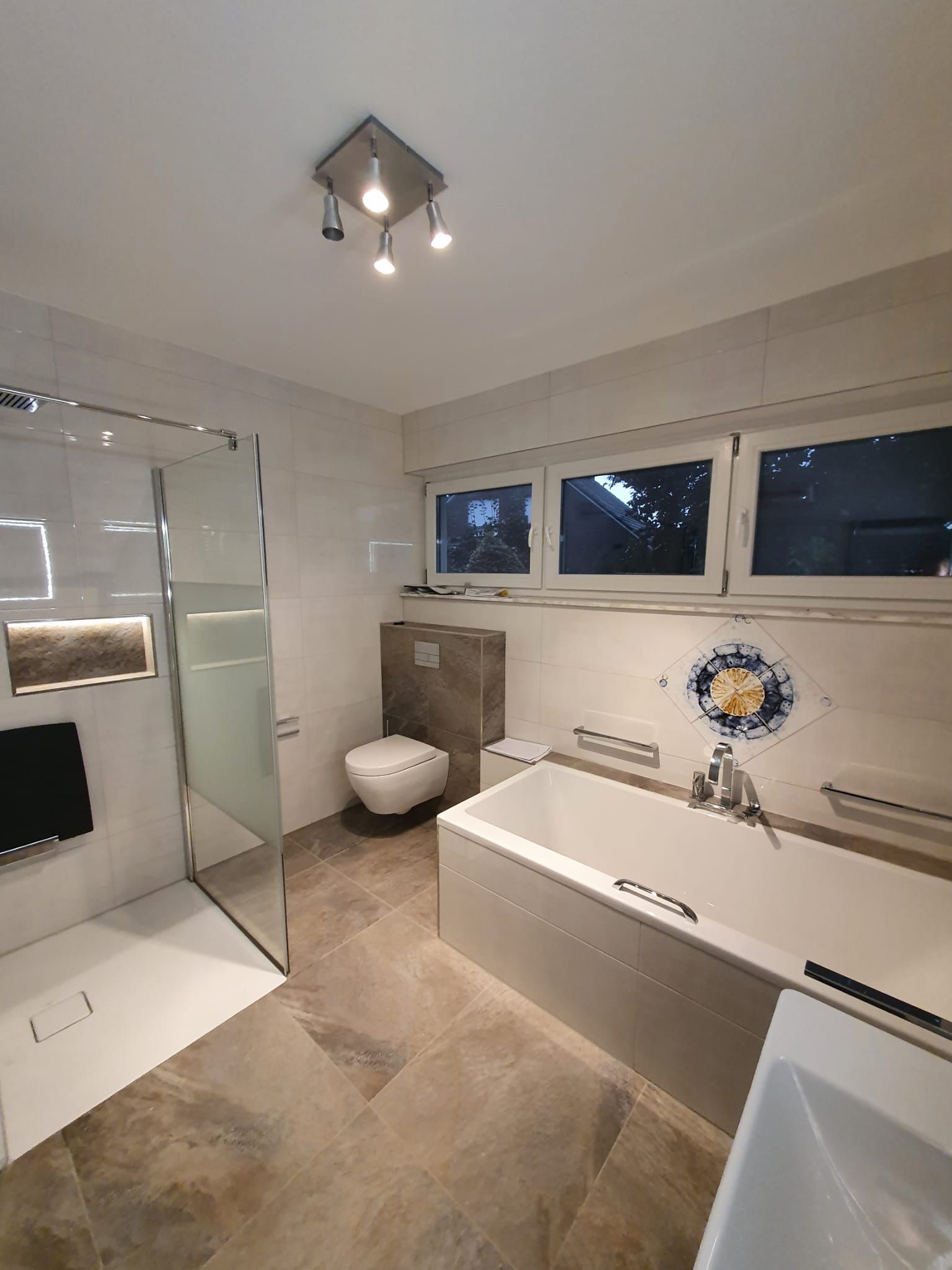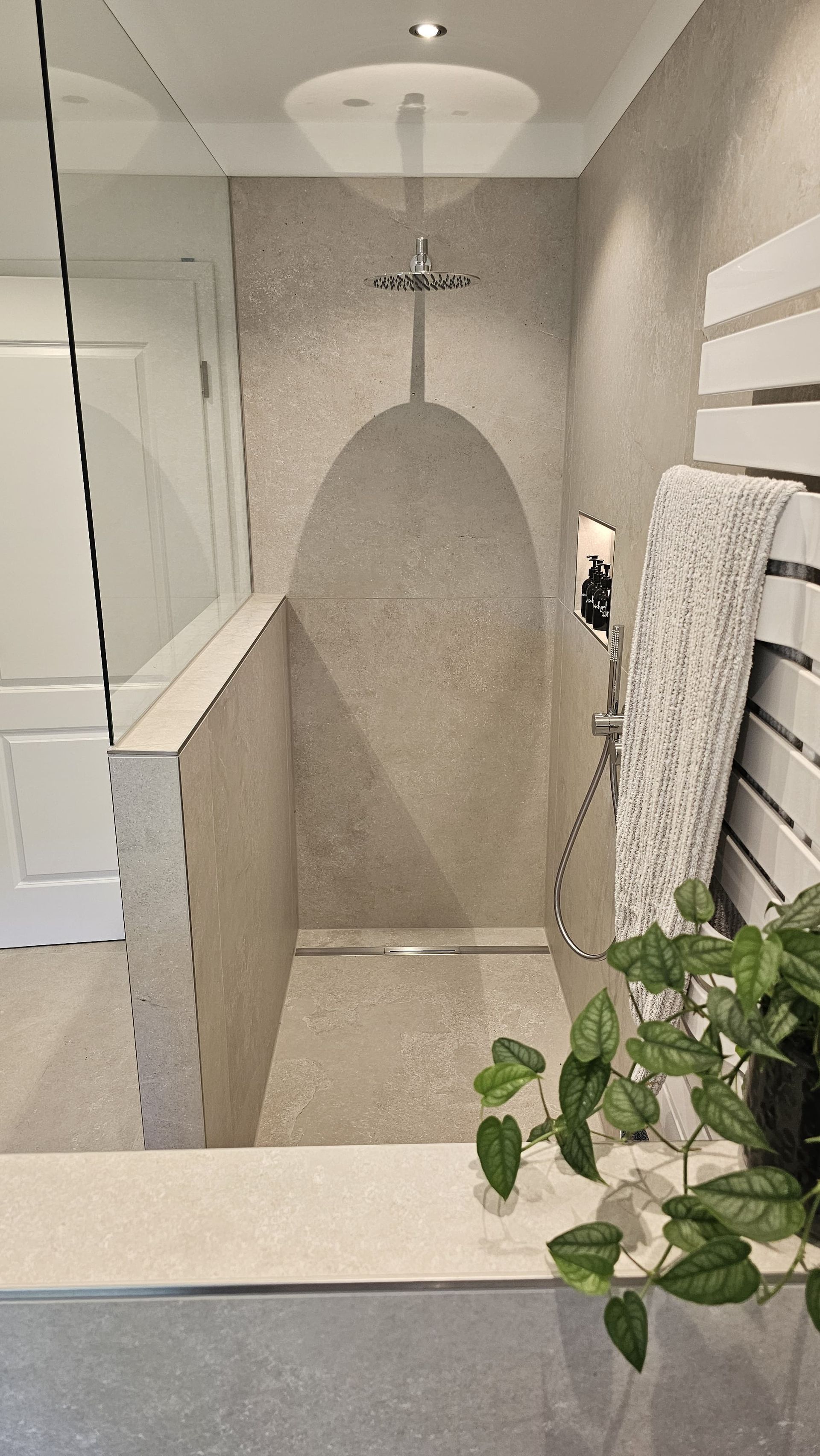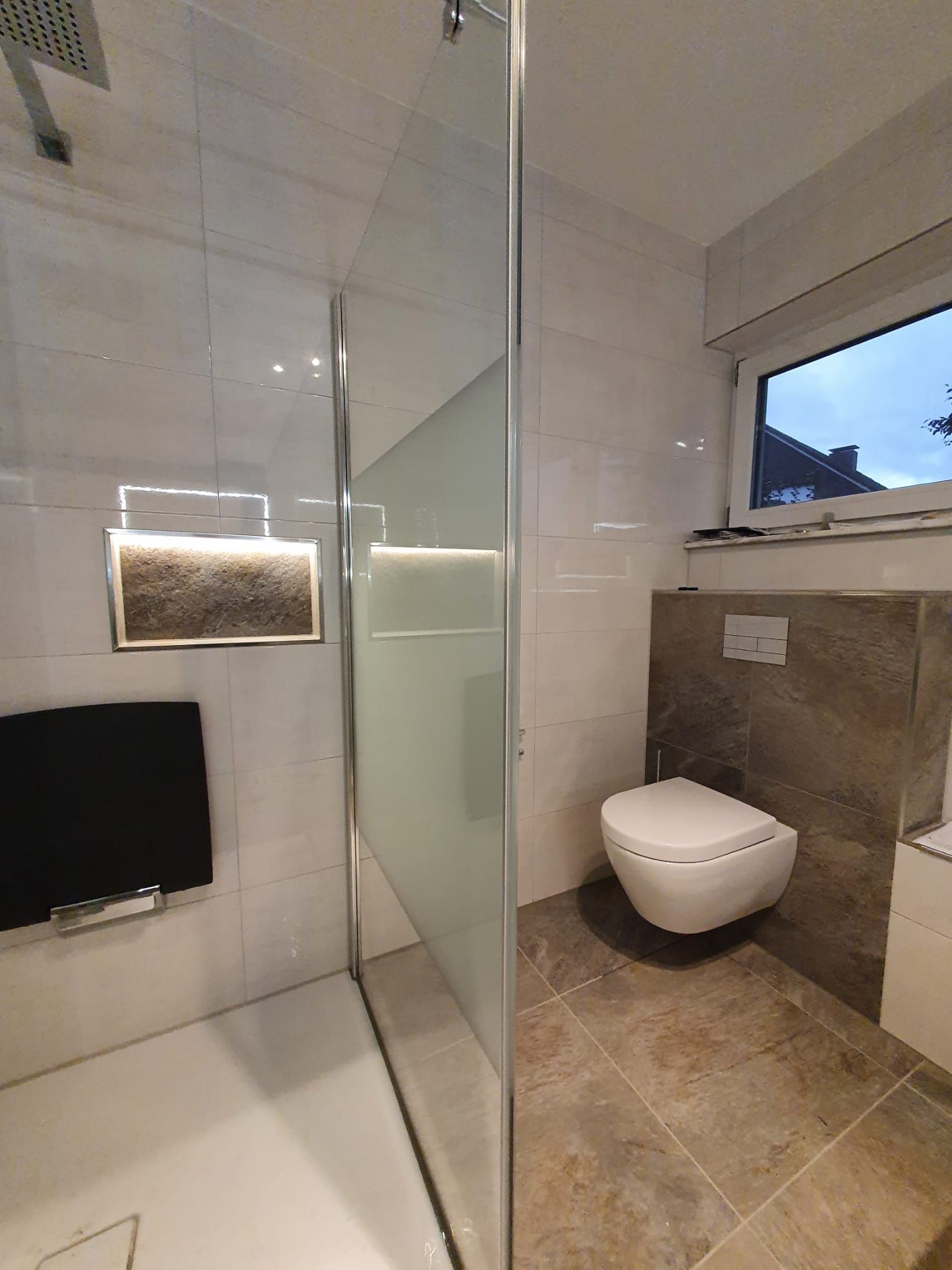 Badsanierung mit Lichtakzenten und Feinsteinzeugfliesen im Format 60x120