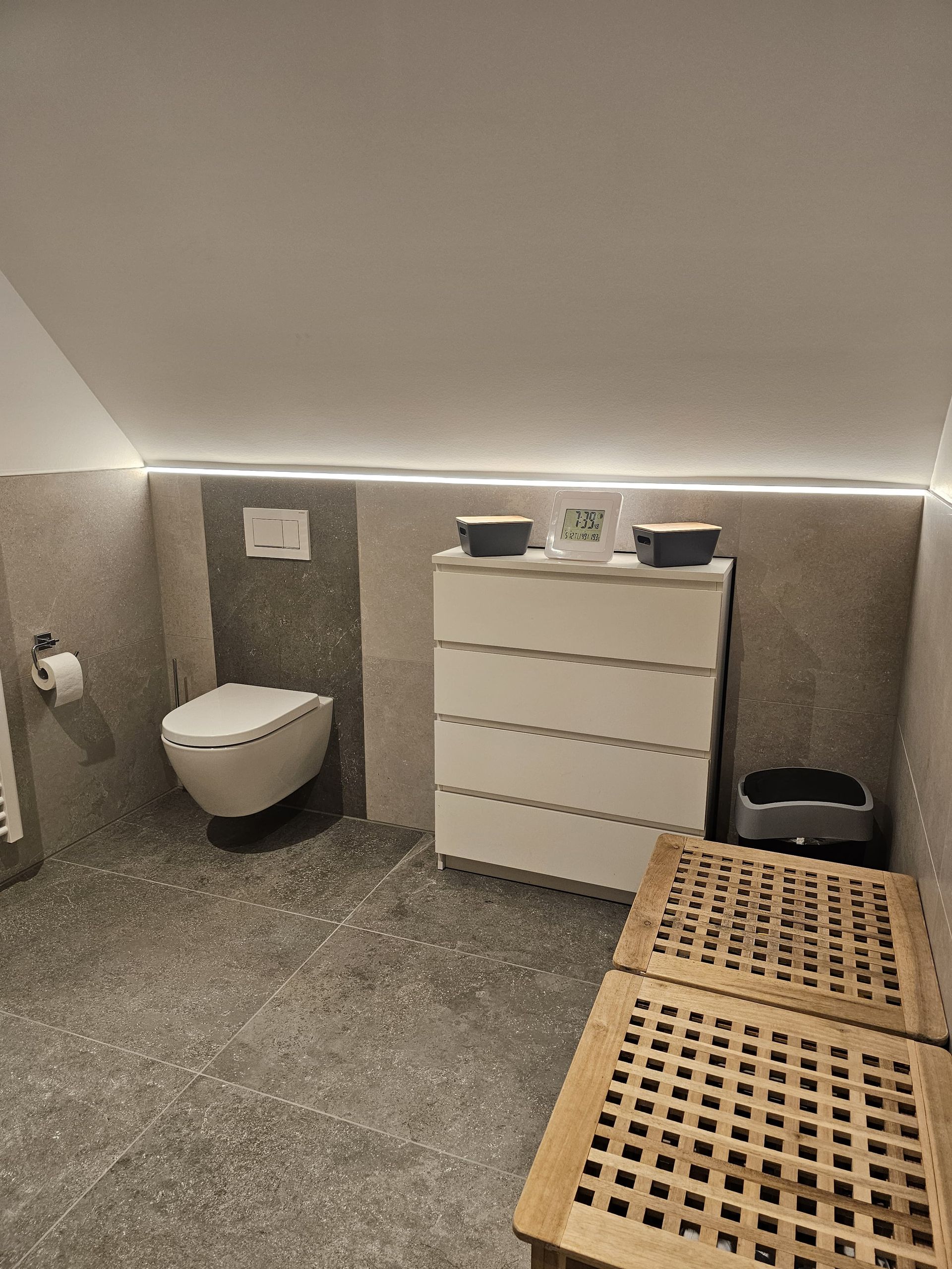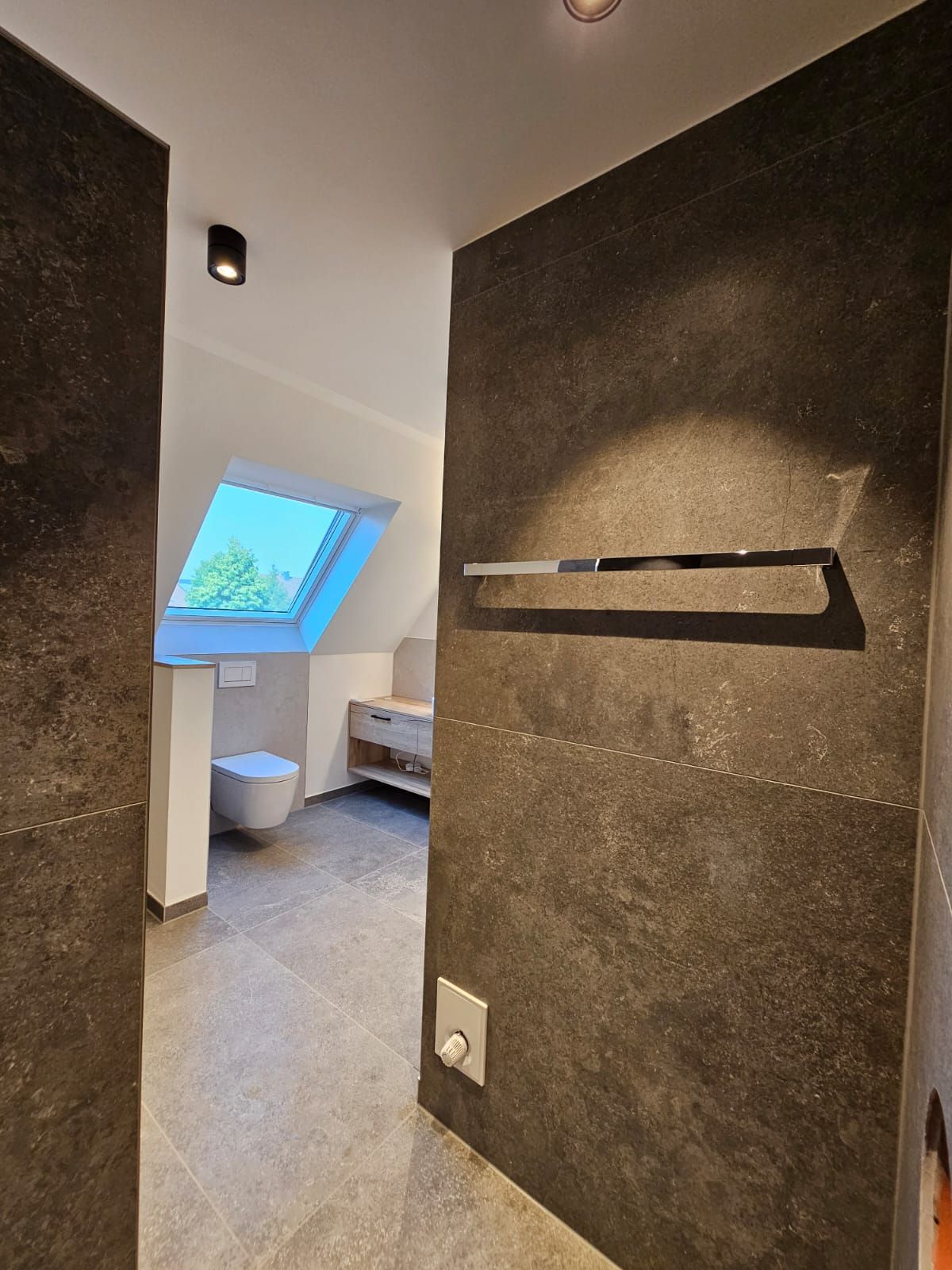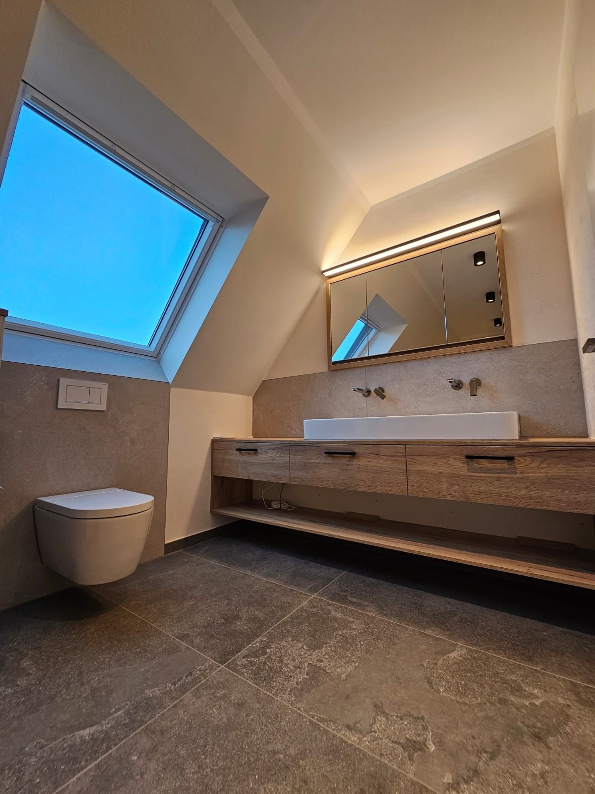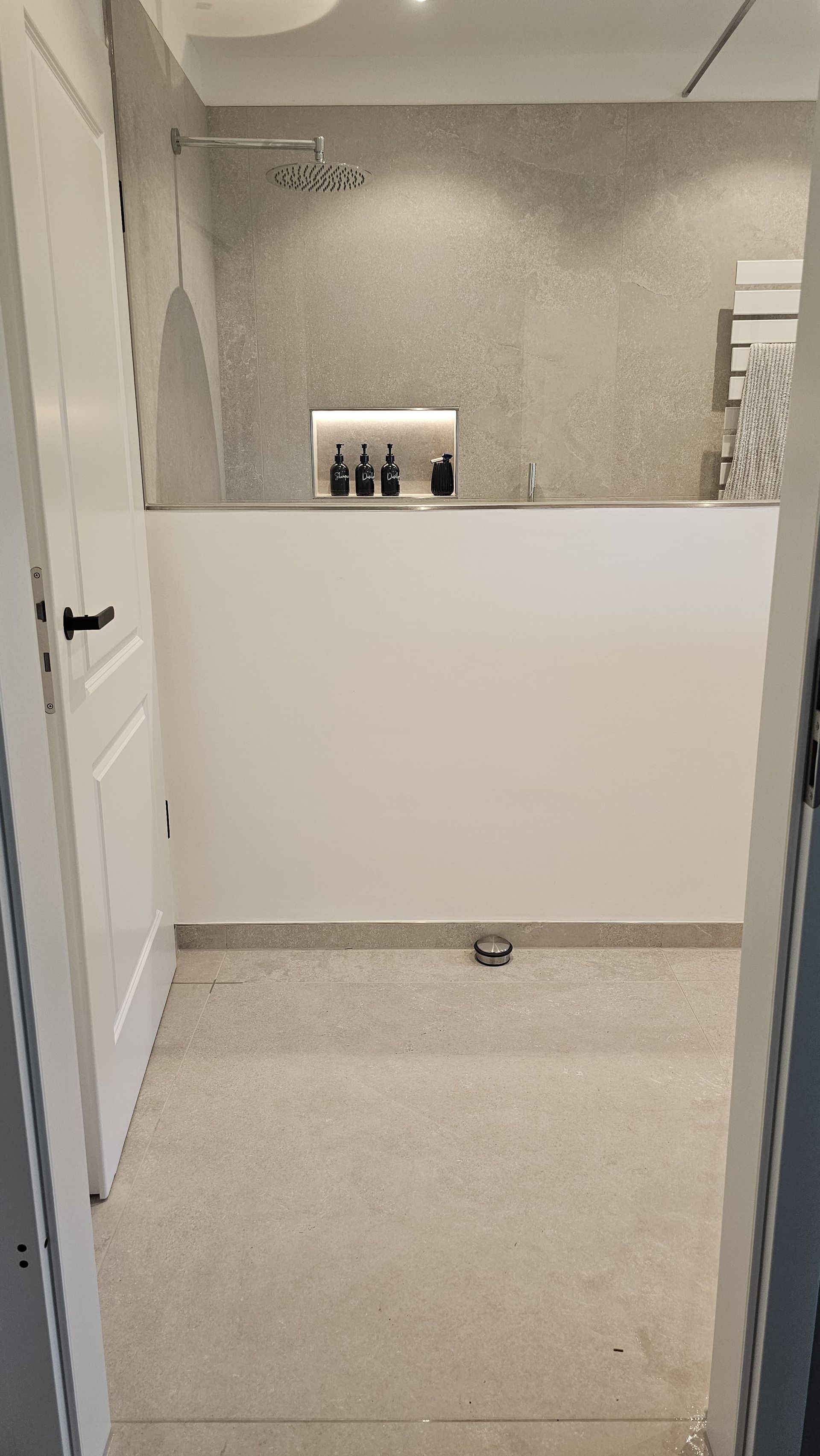 Badsanierung mit Lichtakzenten und Feinsteinzeugfliesen im Format 60x120