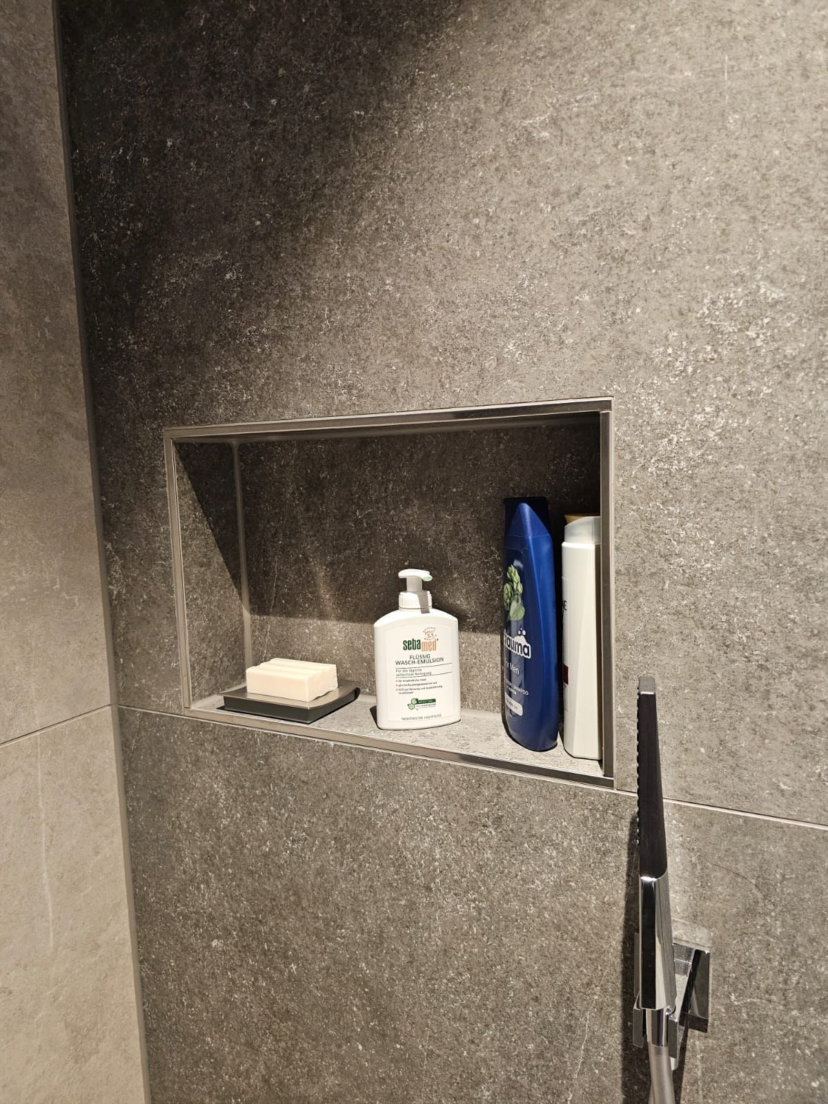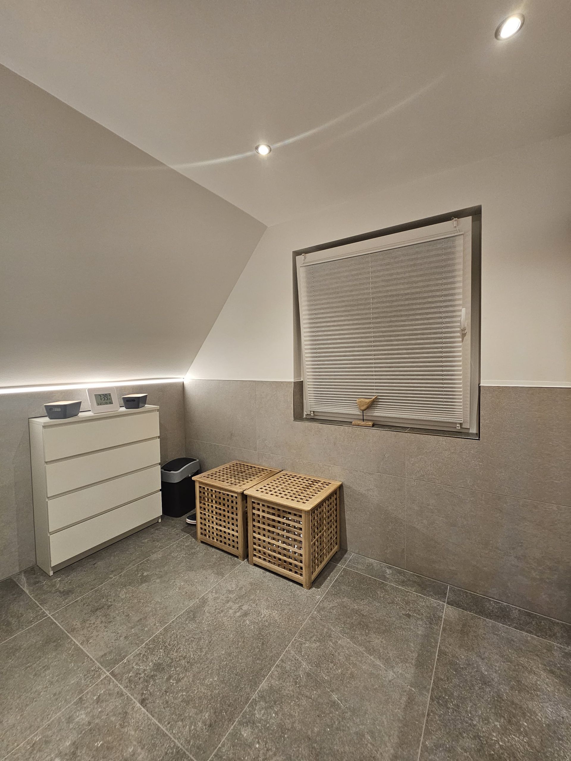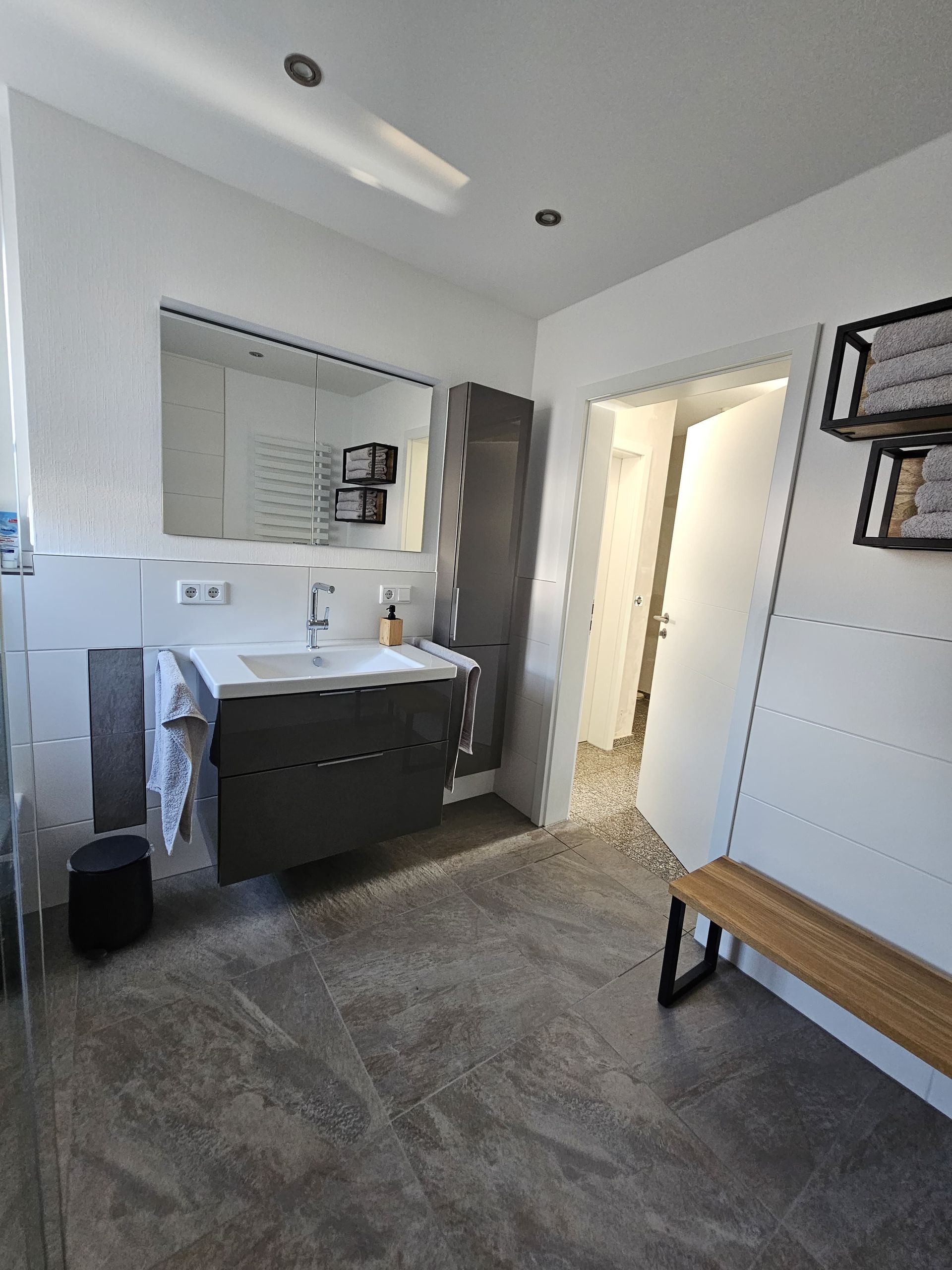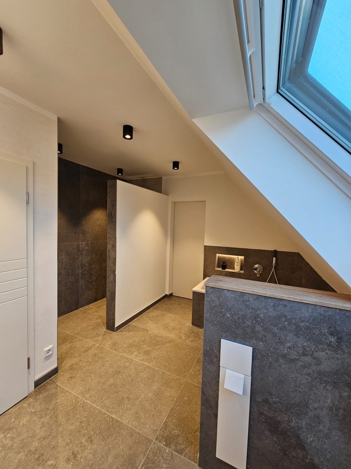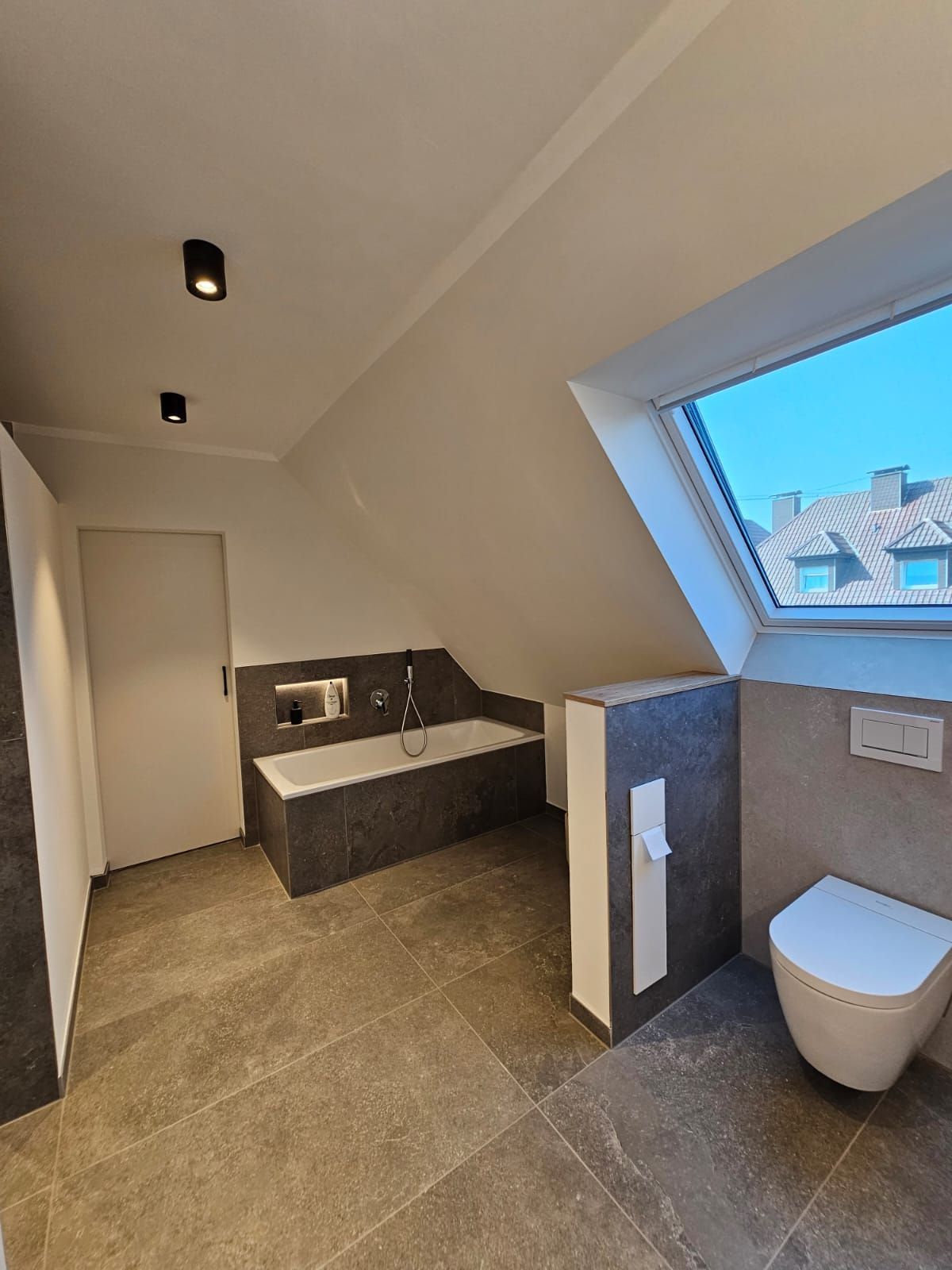 Badsanierung mit Lichtakzenten und Feinsteinzeugfliesen im Format 60x120