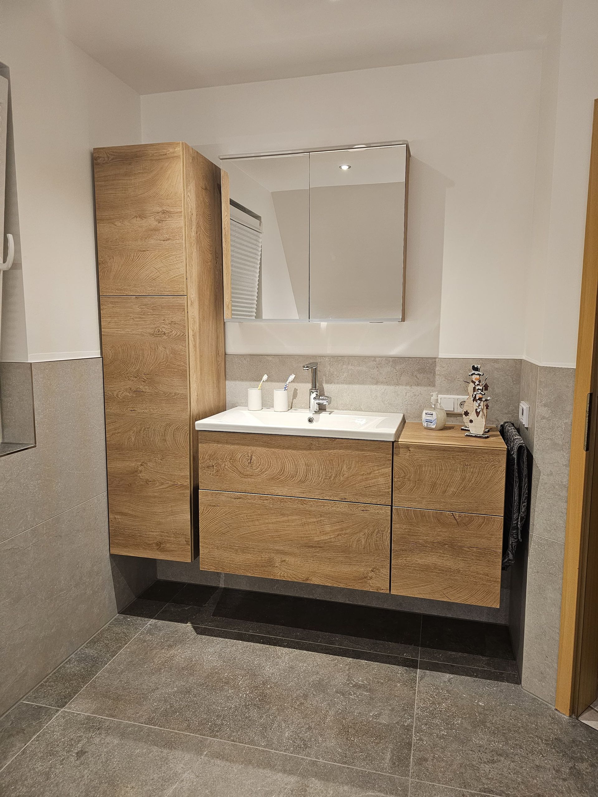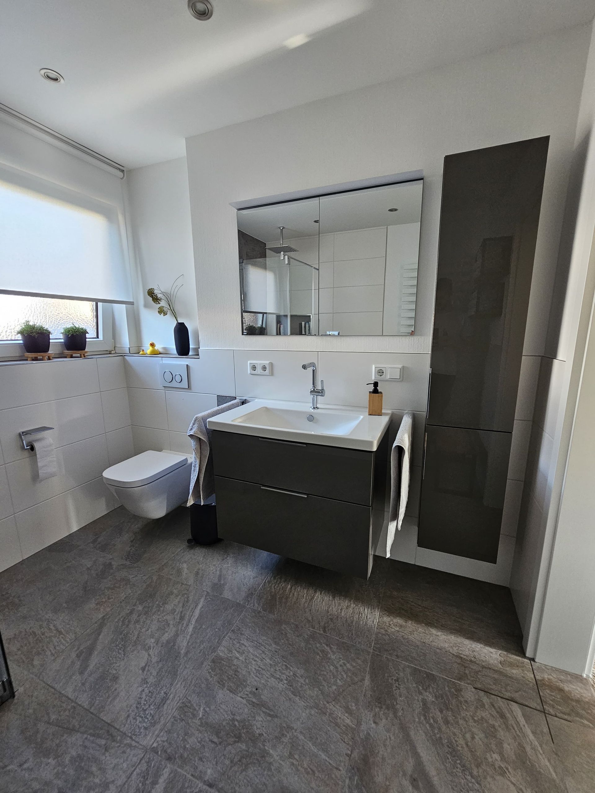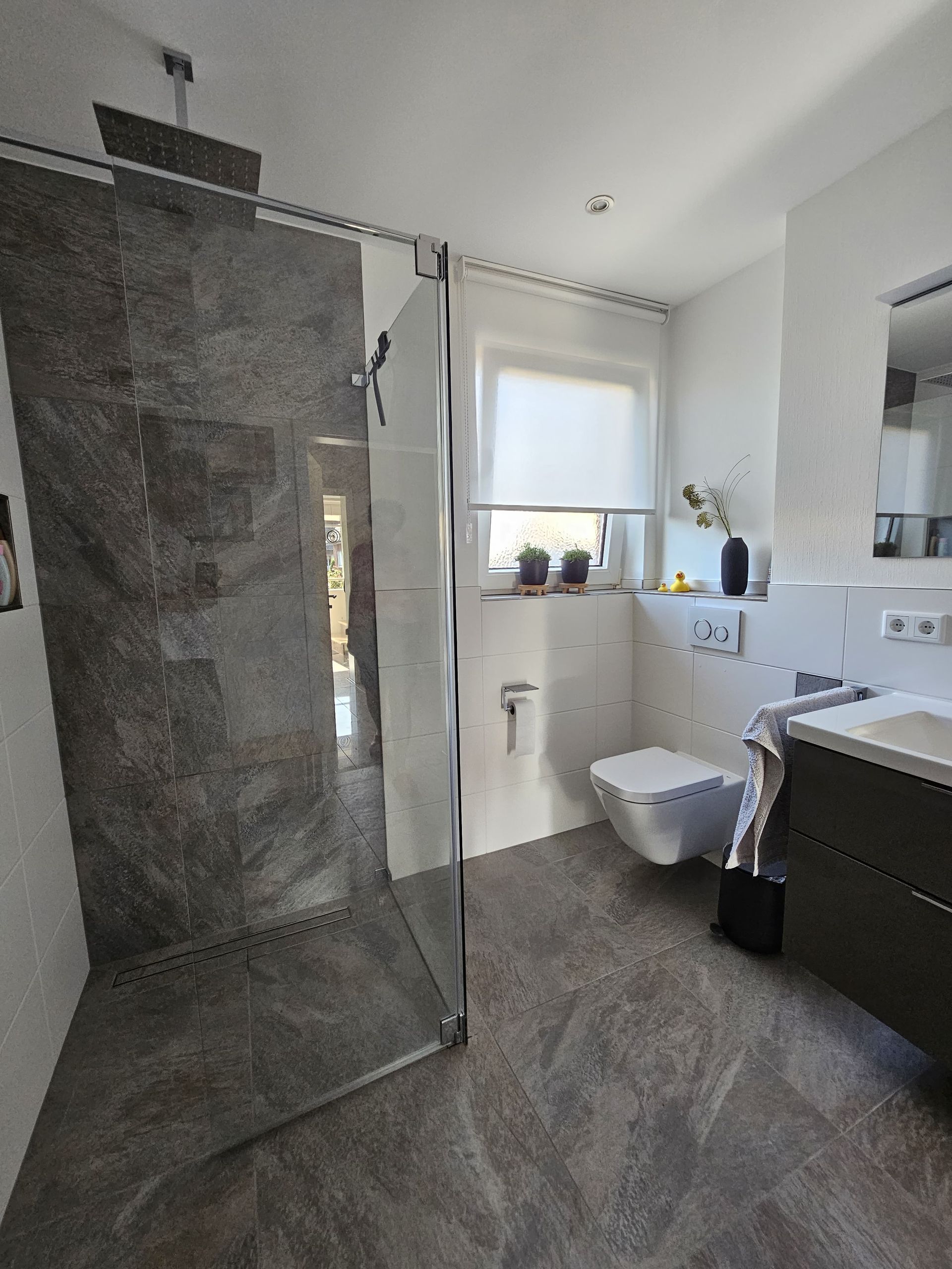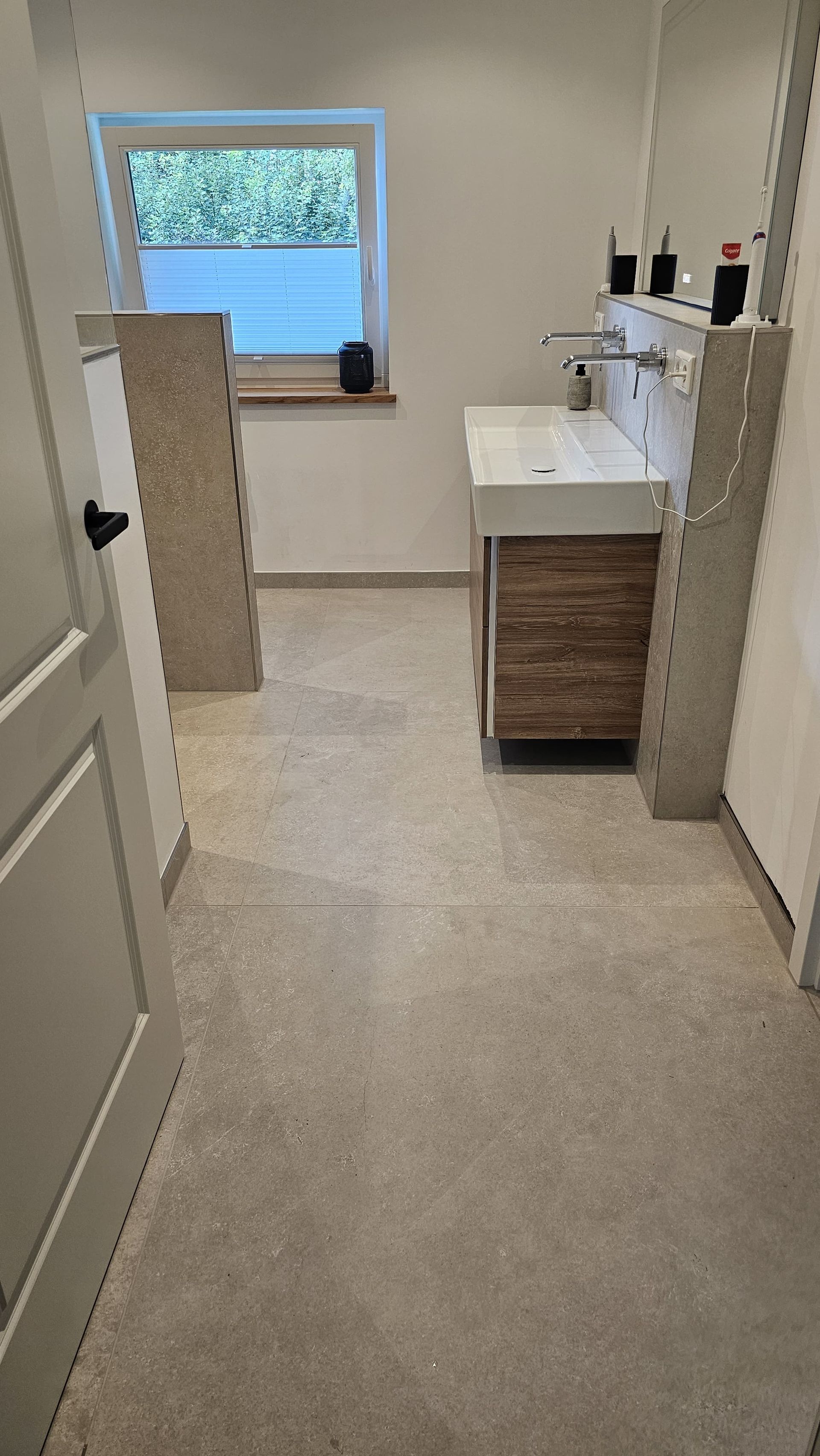 Badsanierung mit großformatigen Fliesen in den Formaten 120x120 (Wand) und 60x120 (Boden)