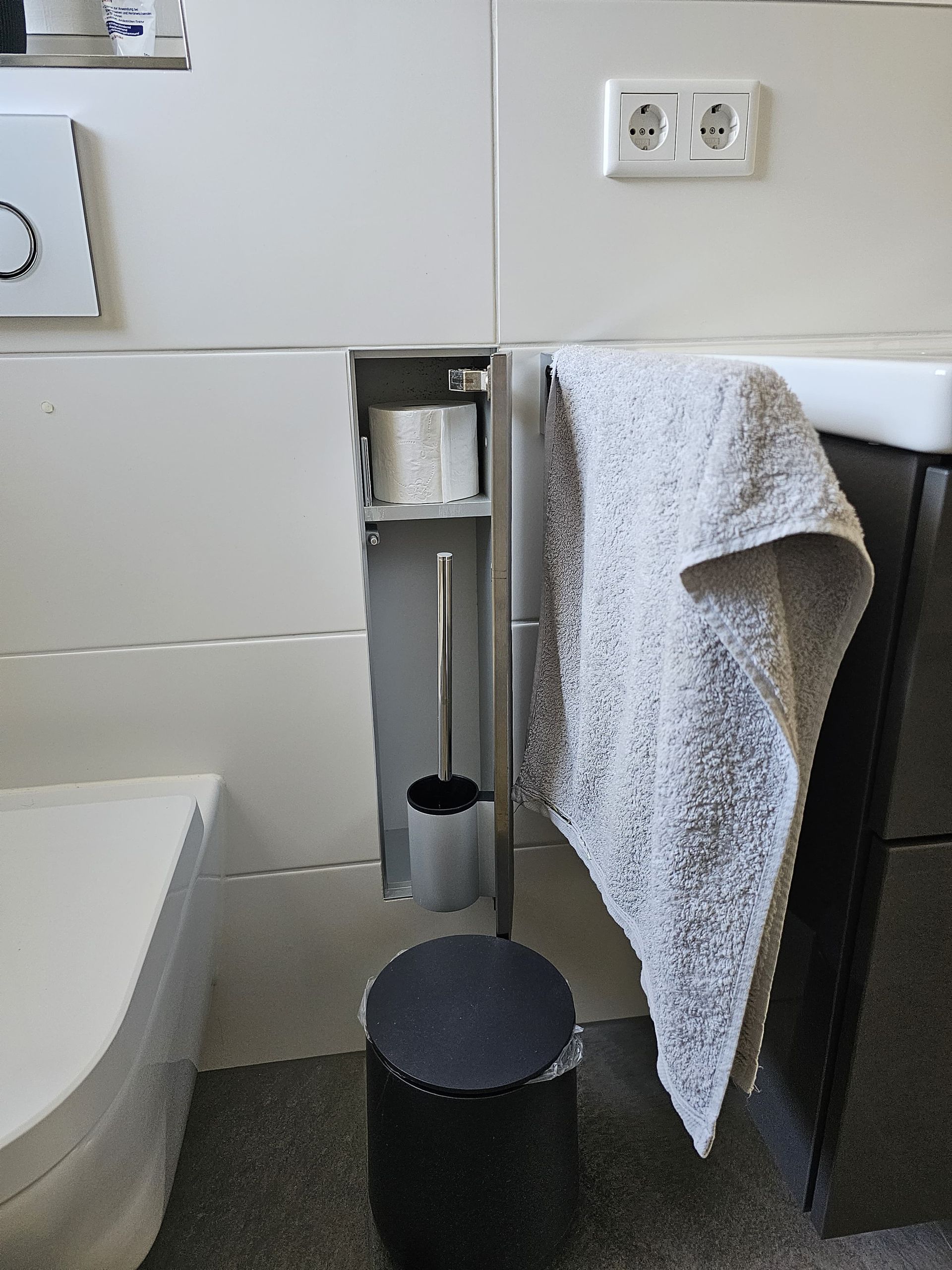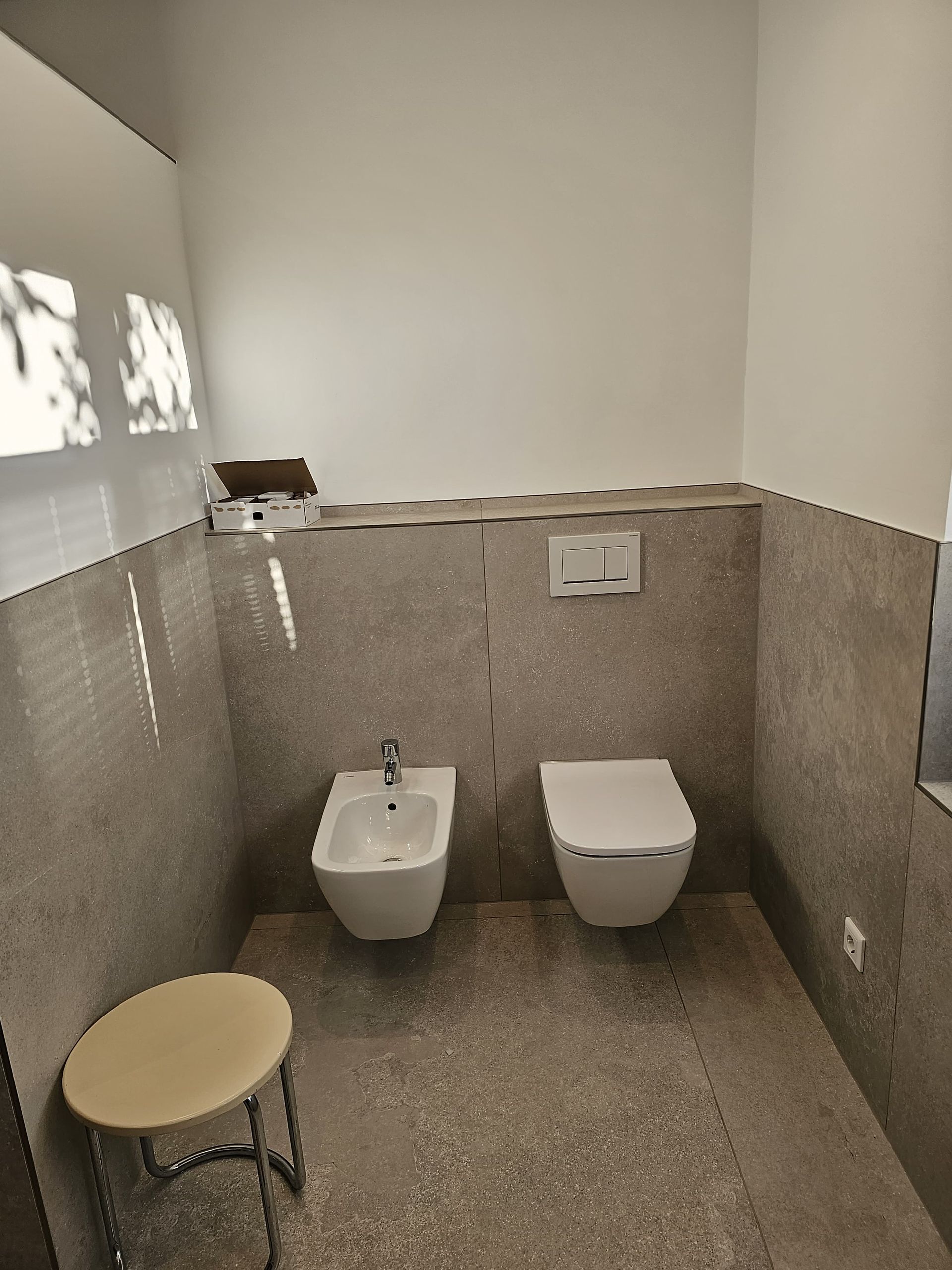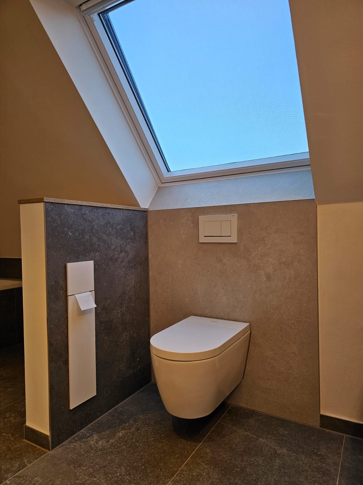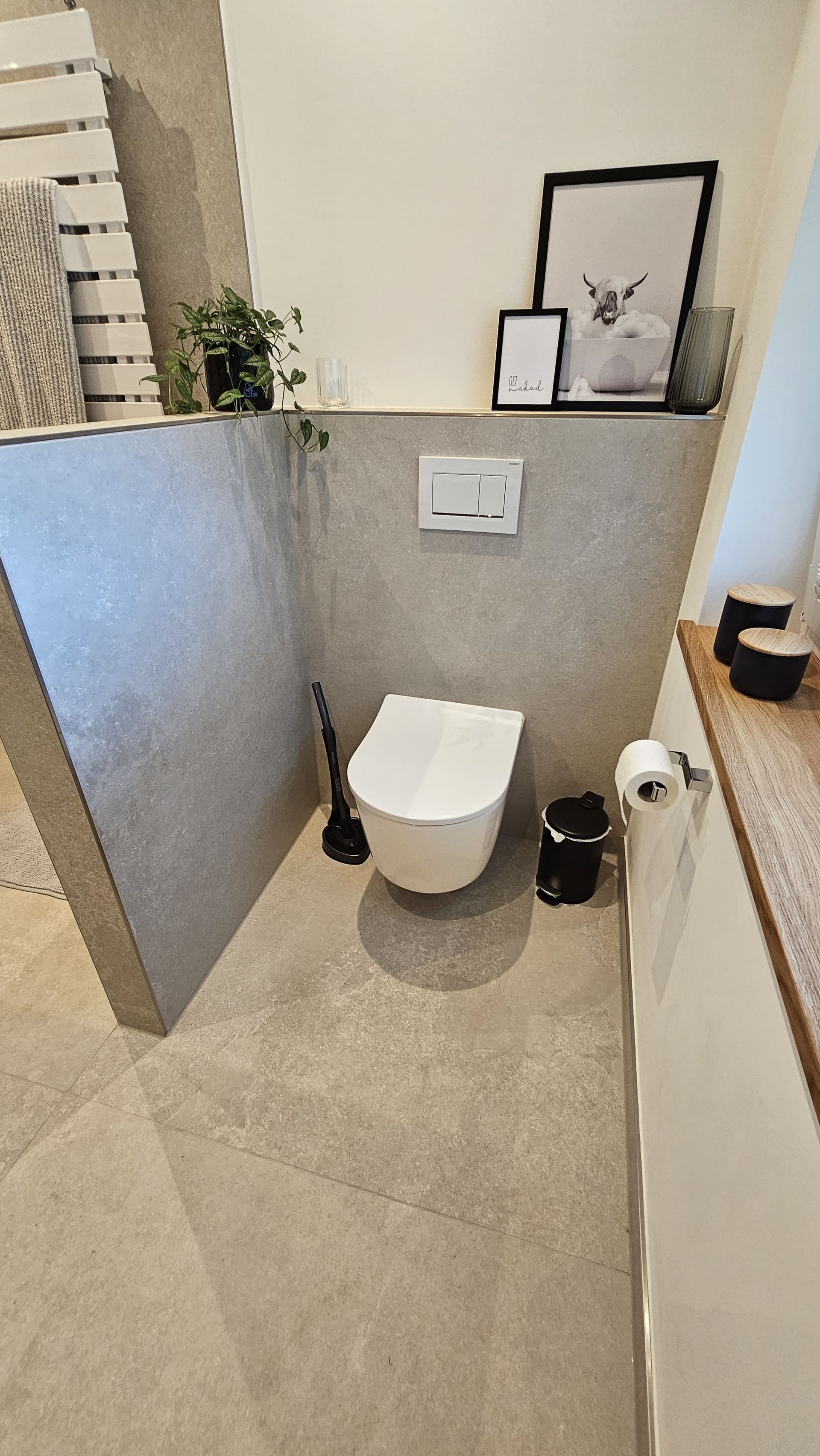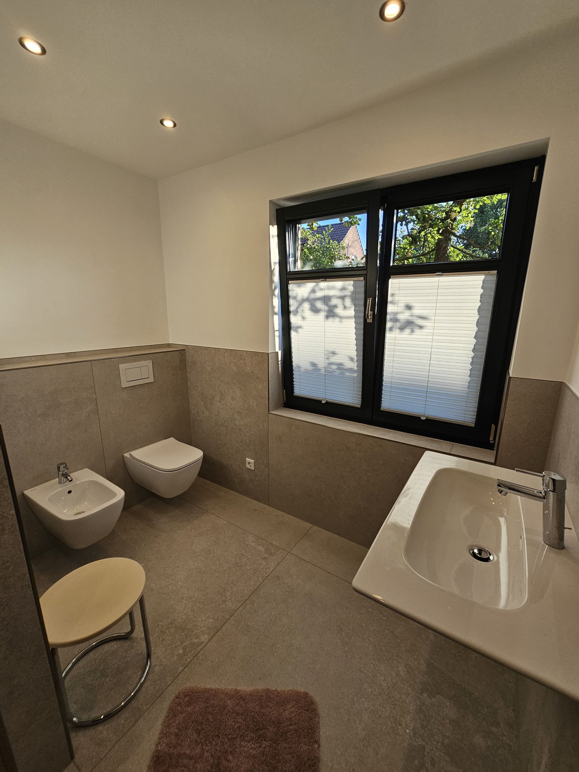 Badsanierung mit großformatigen Fliesen in den Formaten 120x120 (Wand) und 60x120 (Boden)