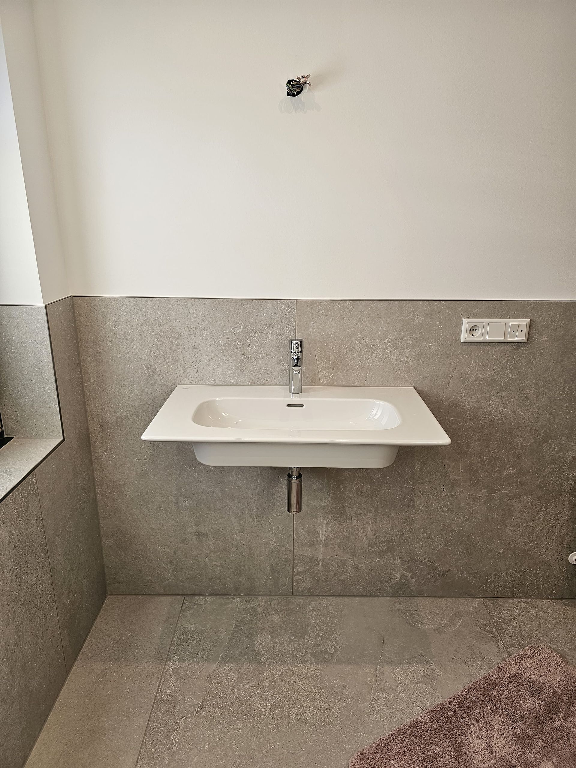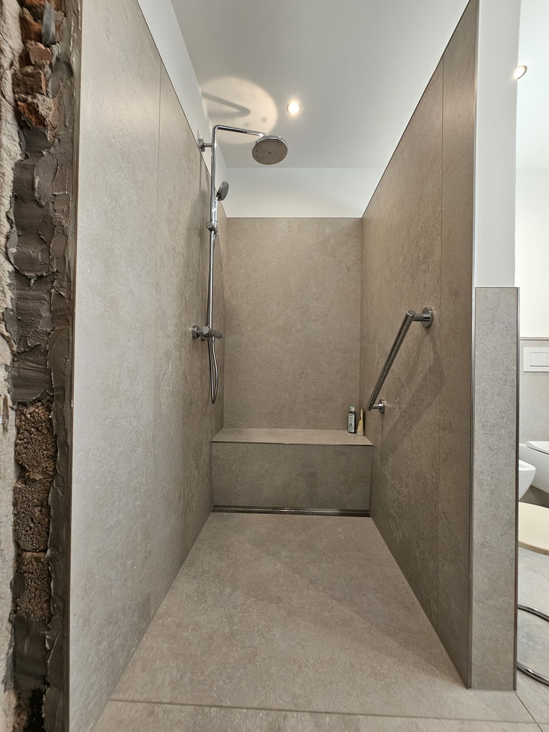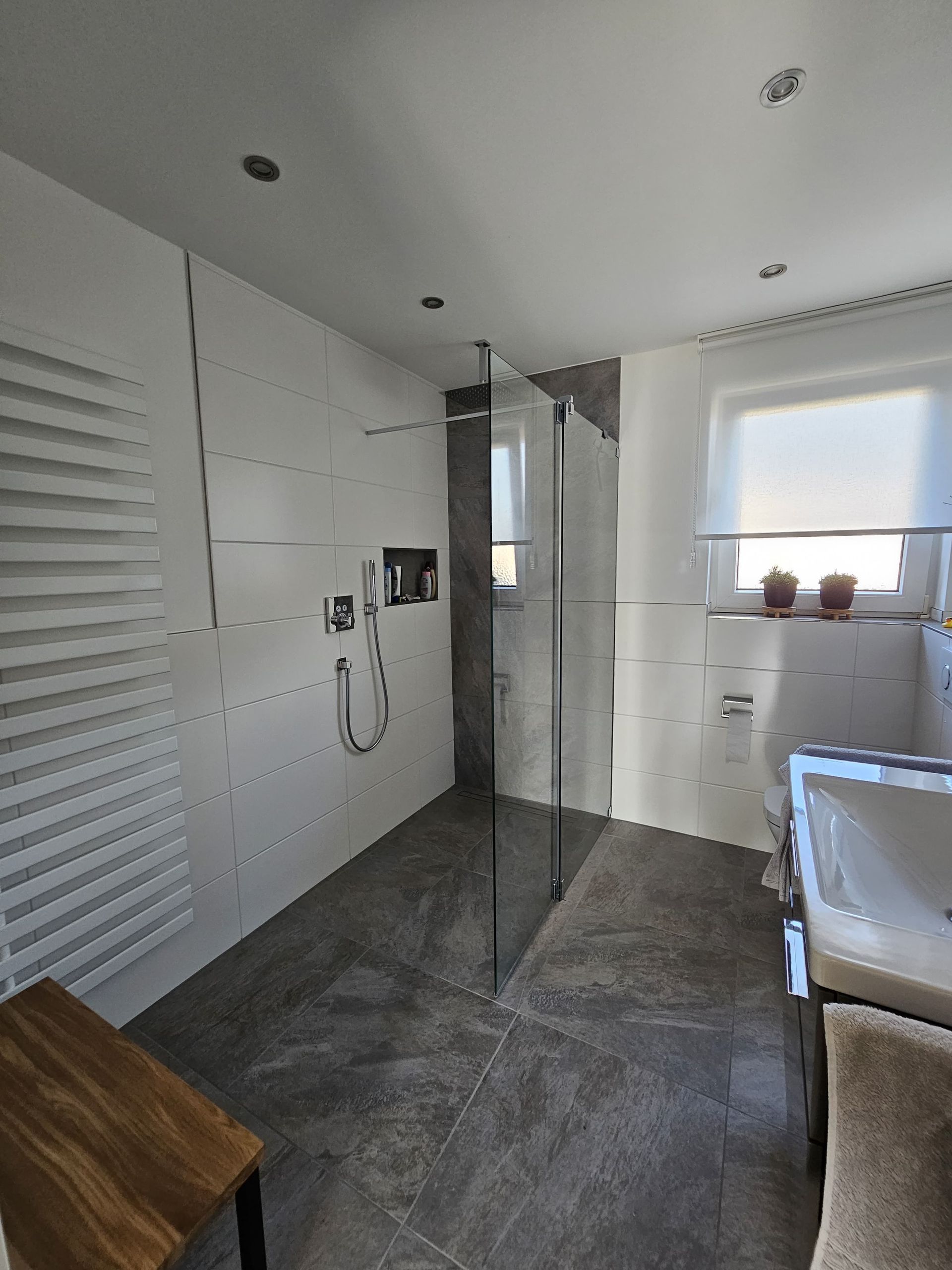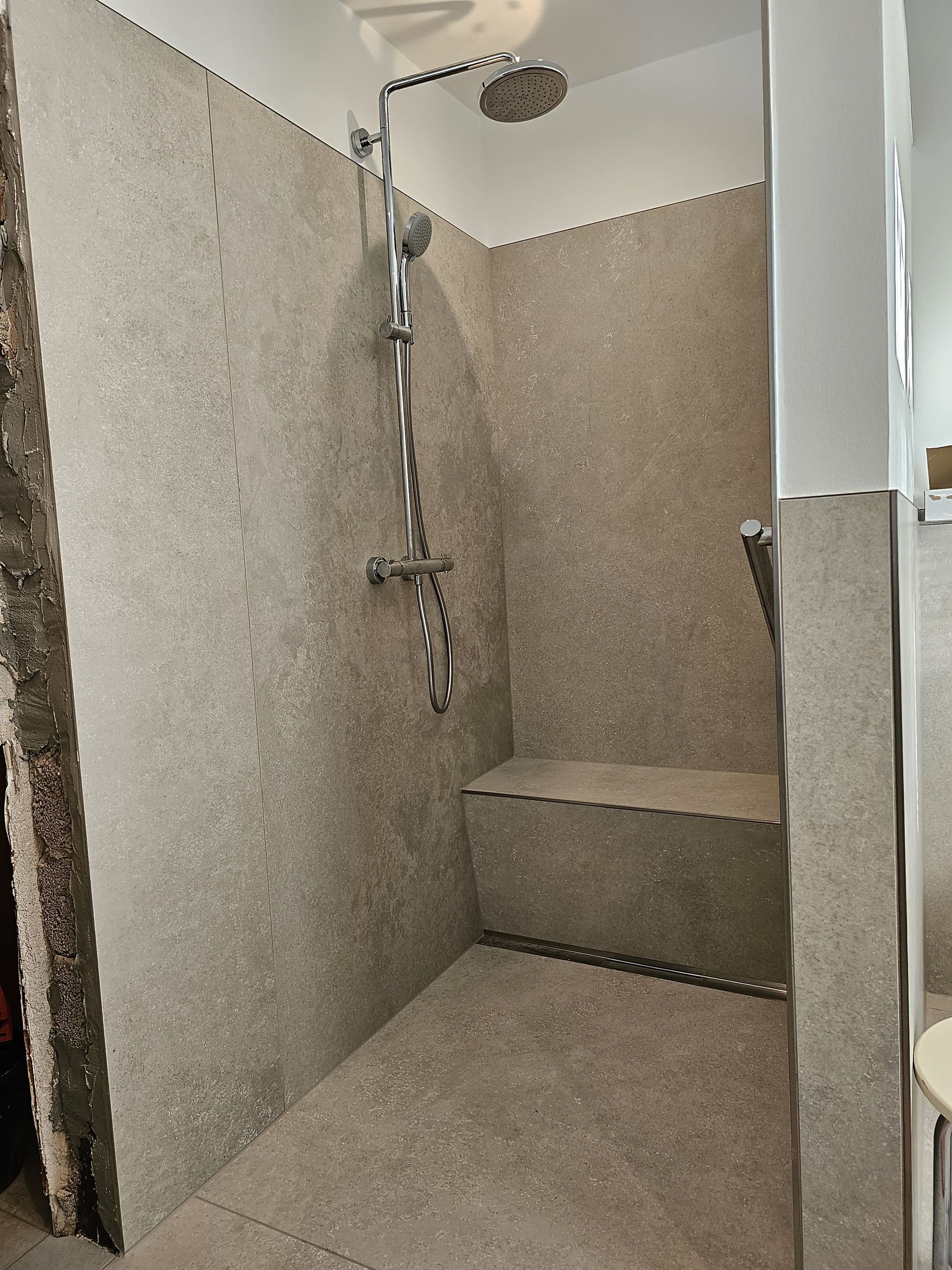 Badsanierung mit XXL Fliesen im Format 120x120 und im Duschbereich 120x240