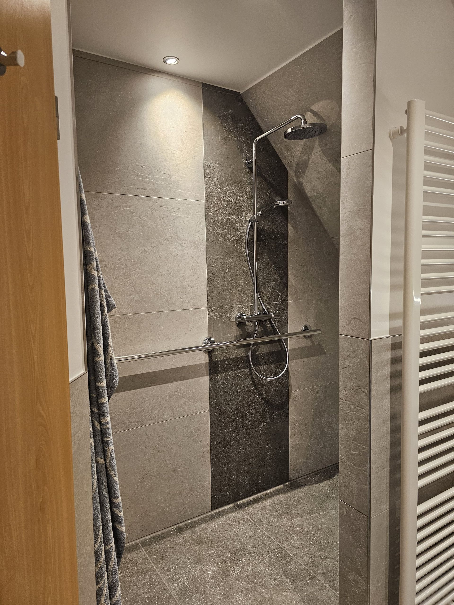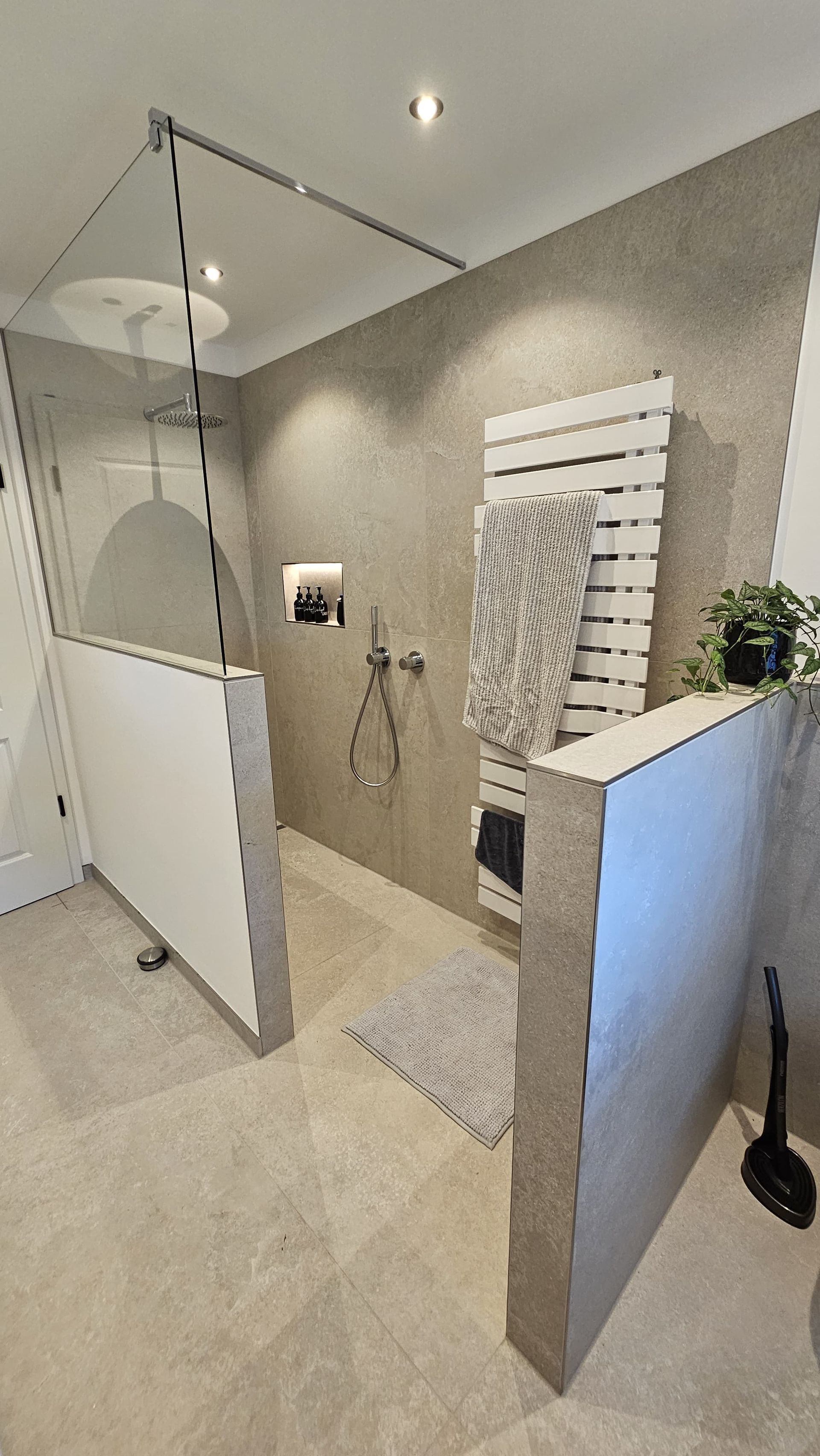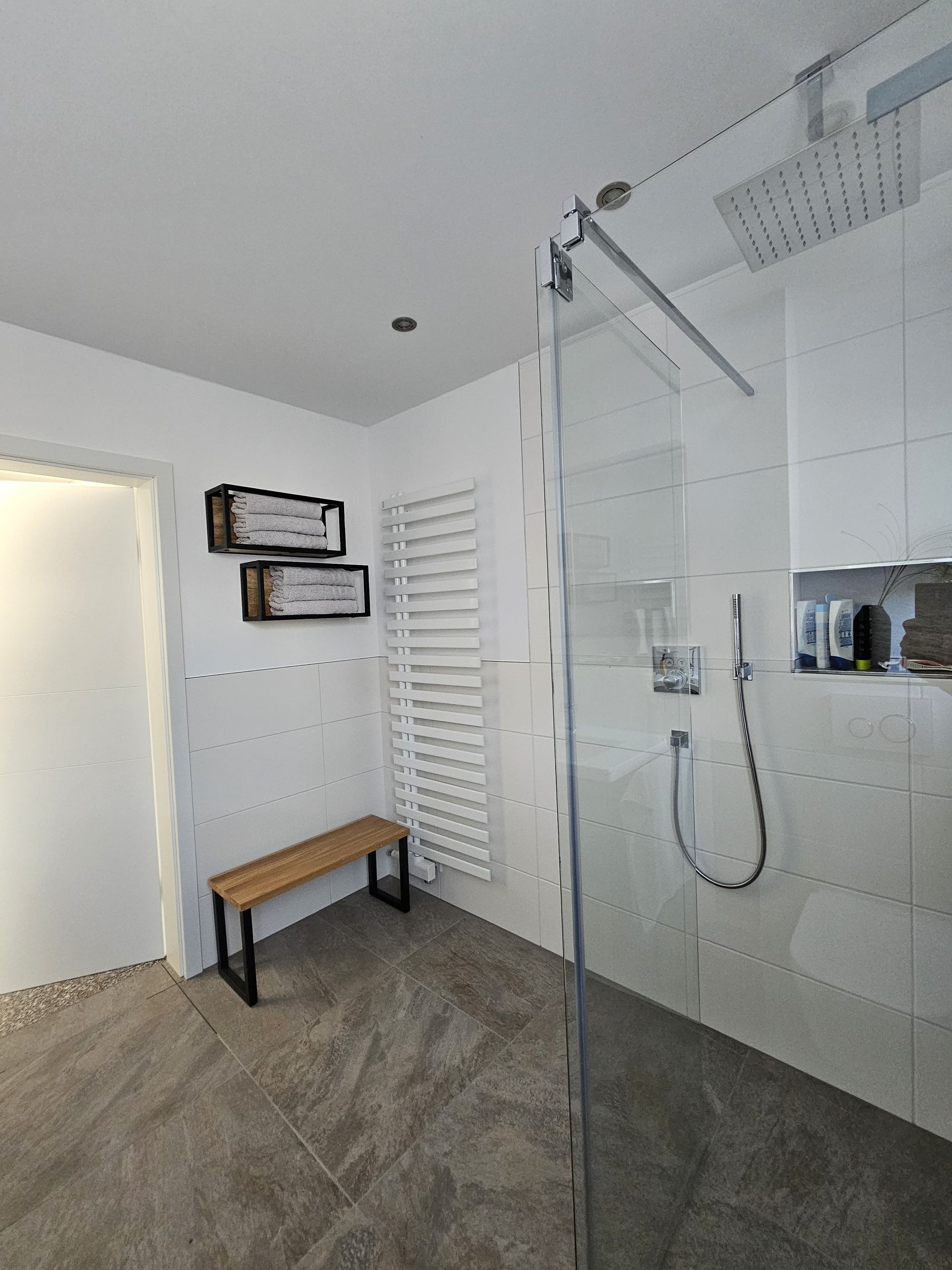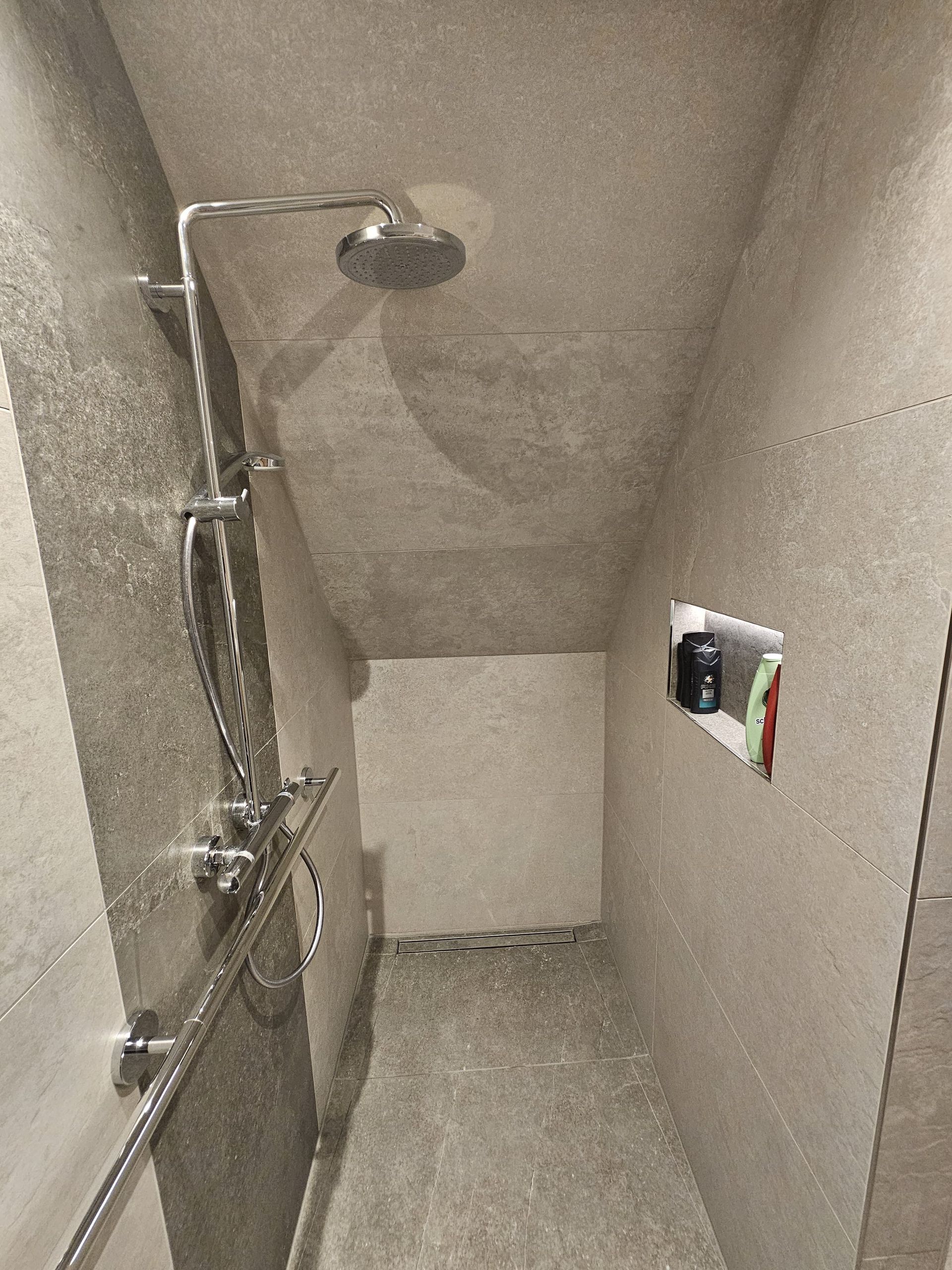 Badsanierung mit XXL Fliesen im Format 120x120 und im Duschbereich 120x240