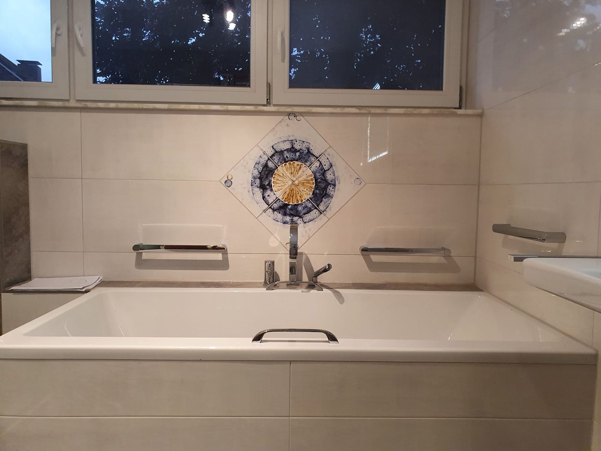 barrierefreie Badsanierung mit Lichtakzent und Mitaufnahme der alten Badfliesen als Dekor über der Badewanne